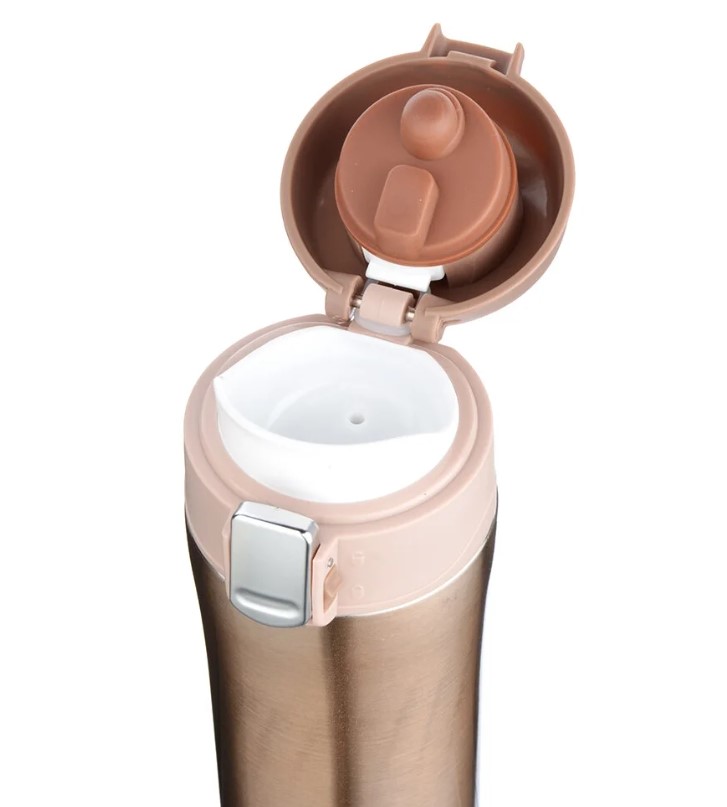 Герметичная крышка с фиксатором исключает проливание жидкости и испарение тепла.