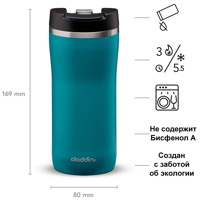 Крышка оснащена двумя прокладками и имеет замок Leak-Lock для предотвращения случайного открытия и разлива напитка. Вакуумная изоляция Thermavac (нержавеющая сталь с двойными стенками) обеспечивает длительное сохранение температуры напитка прохладной до 5,5 часов и горячей - до 3 часов.