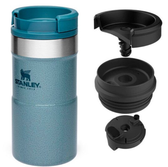 Термокружка 0,25L c корпусом и внутренней колбой из нержавеющей стали 18/8. Поворотная крышка фиксируется в трёх положениях: по часовой стрелке поворот направо – закрыть, налево против часовой стрелки – открыть, чтобы попить, поворот налево после открытого положения – разобрать крышку для мытья