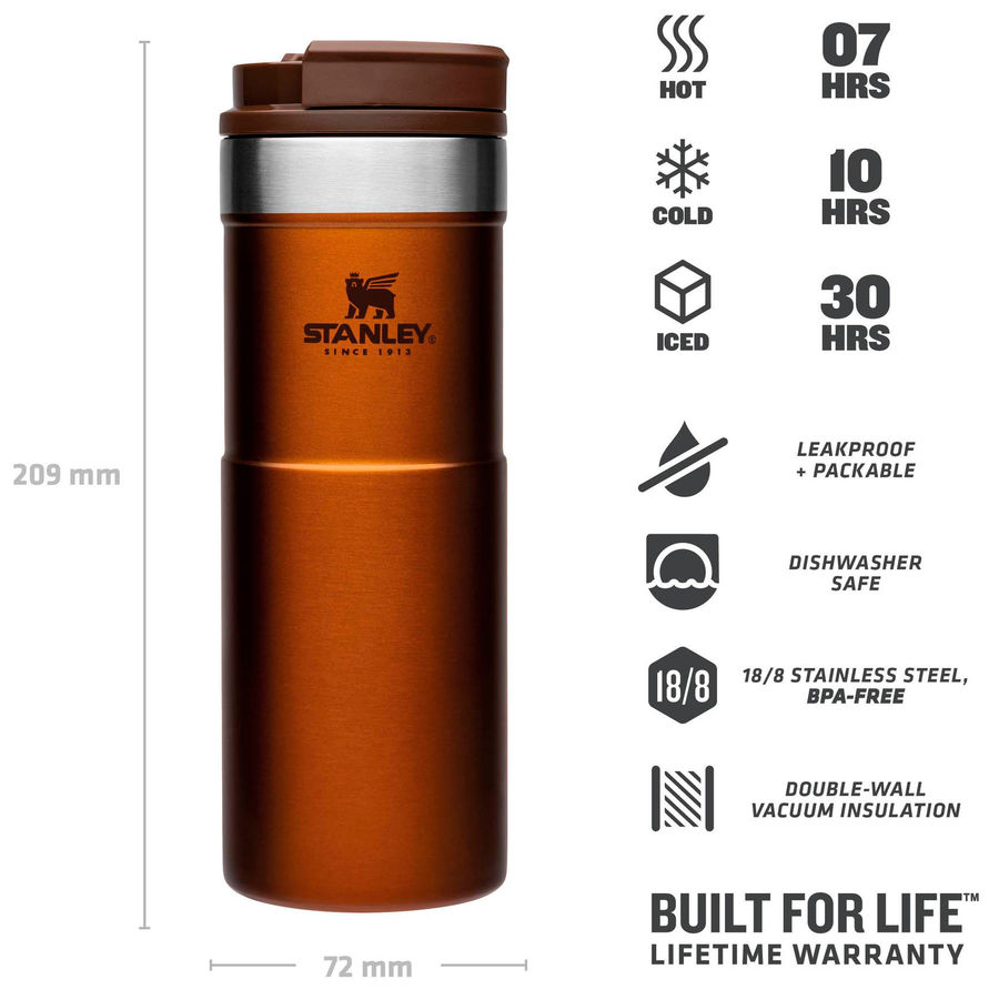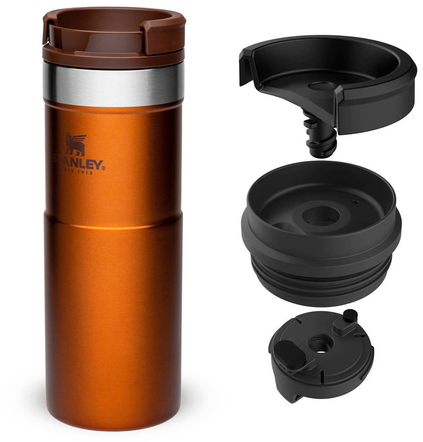 Термокружка 0,47L c корпусом и внутренней колбой из нержавеющей стали 18/8. Поворотная крышка фиксируется в трёх положениях: по часовой стрелке поворот направо – закрыть, налево против часовой стрелки – открыть, чтобы попить, поворот налево после открытого положения – разобрать крышку для мытья