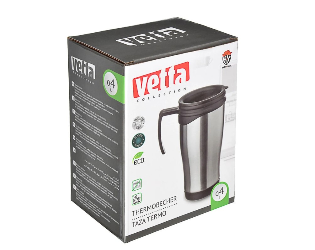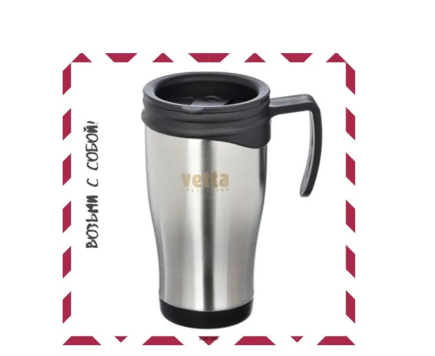 Термокружка VETTA сохраняет объемом 400мл напитки (чай, кофе) теплыми дольше обычного. Изделие выполнено из нержавеющей стали, обладающей гигиеничностью, отличными теплоизоляционными свойствами и повышенной устойчивостью к механическим повреждениям. Надежная крышка термоса исключает проливание жидкости и испарение тепла. Такой аксессуар удобно использовать на отдыхе, работе и в автомобиле.