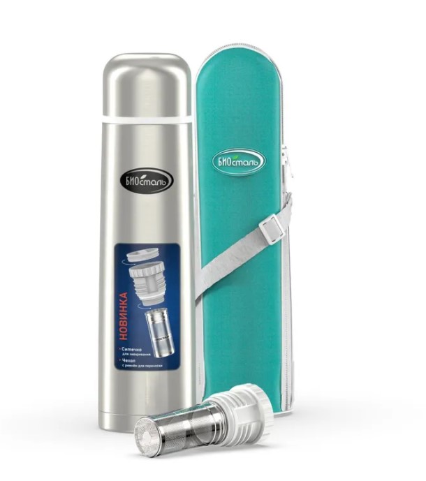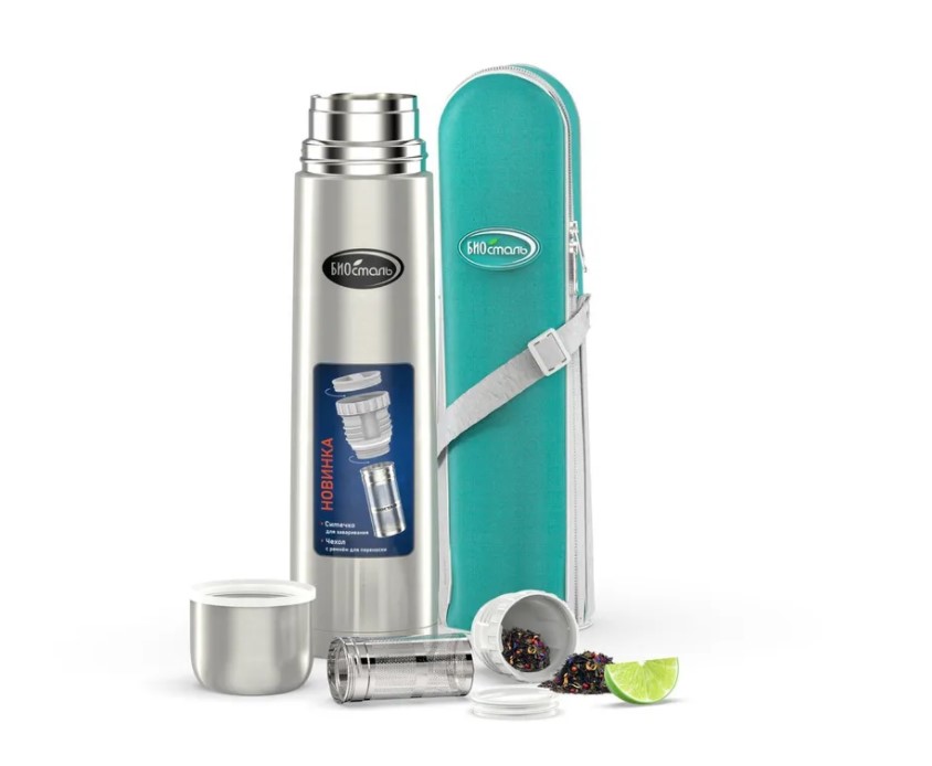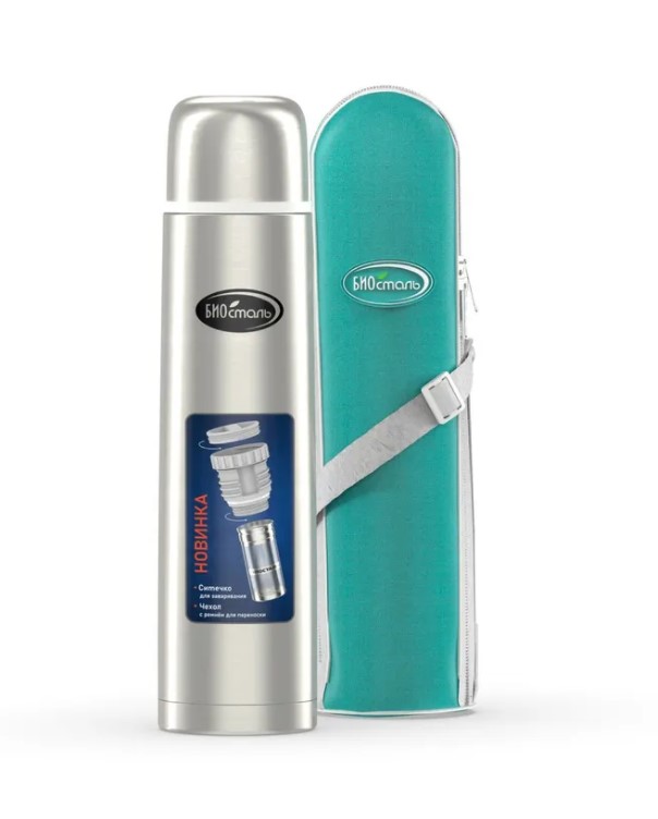 Термос с ситечком из нержавеющей стали и контейнером для хранения в комплекте с защитным чехлом с регулируемым ремешком для удобной переноски. Пробка с дополнительной изоляцией и функцией «термоконтроль» позволяет наливать напитки без полного откручивания пробки под любым углом.
