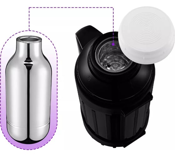 Корпус выполнен из пластика, а внутри – стеклянная колба. Колба не впитывает запахи и обеспечивает длительное сохранение температуры жидкости.