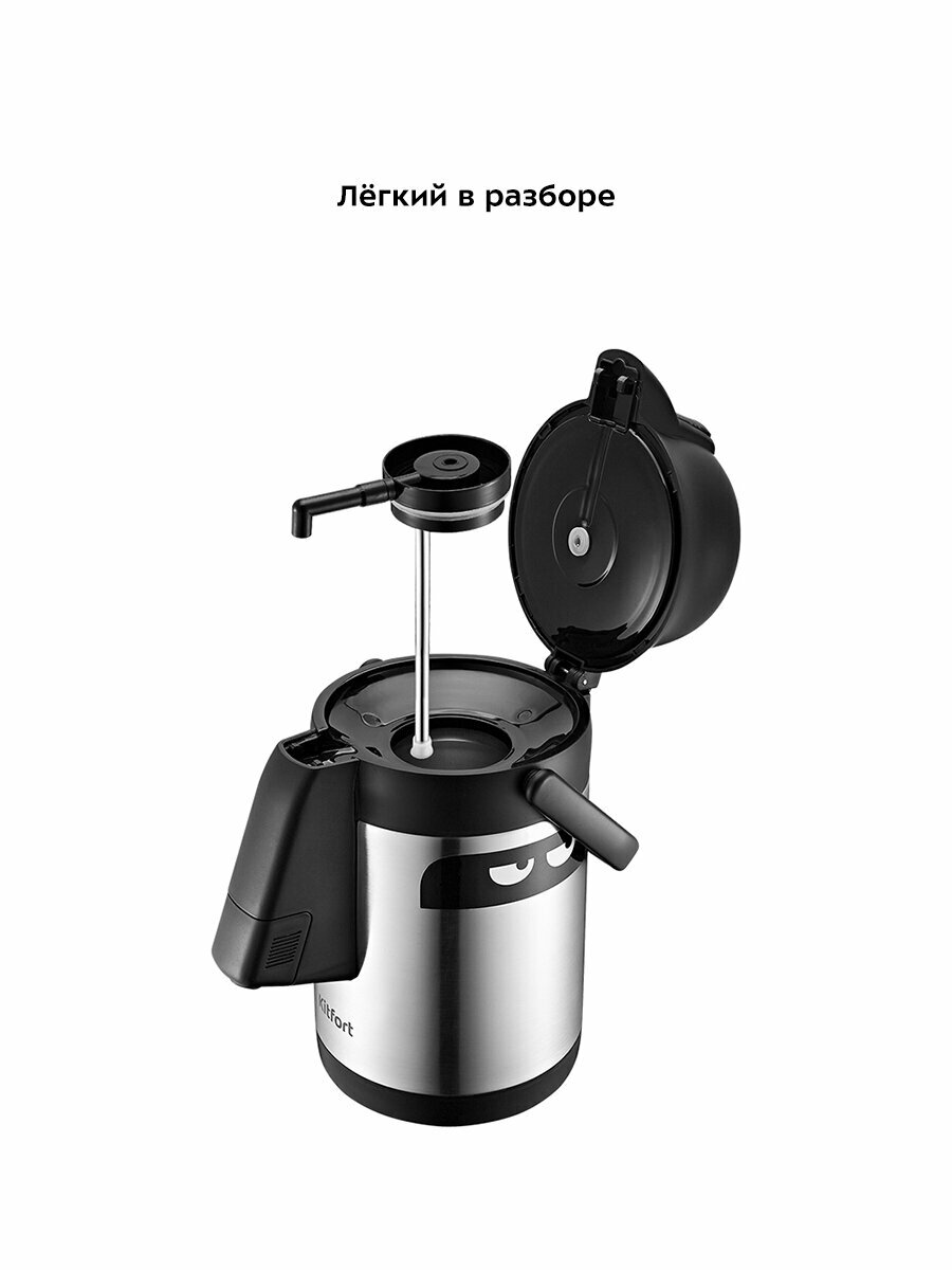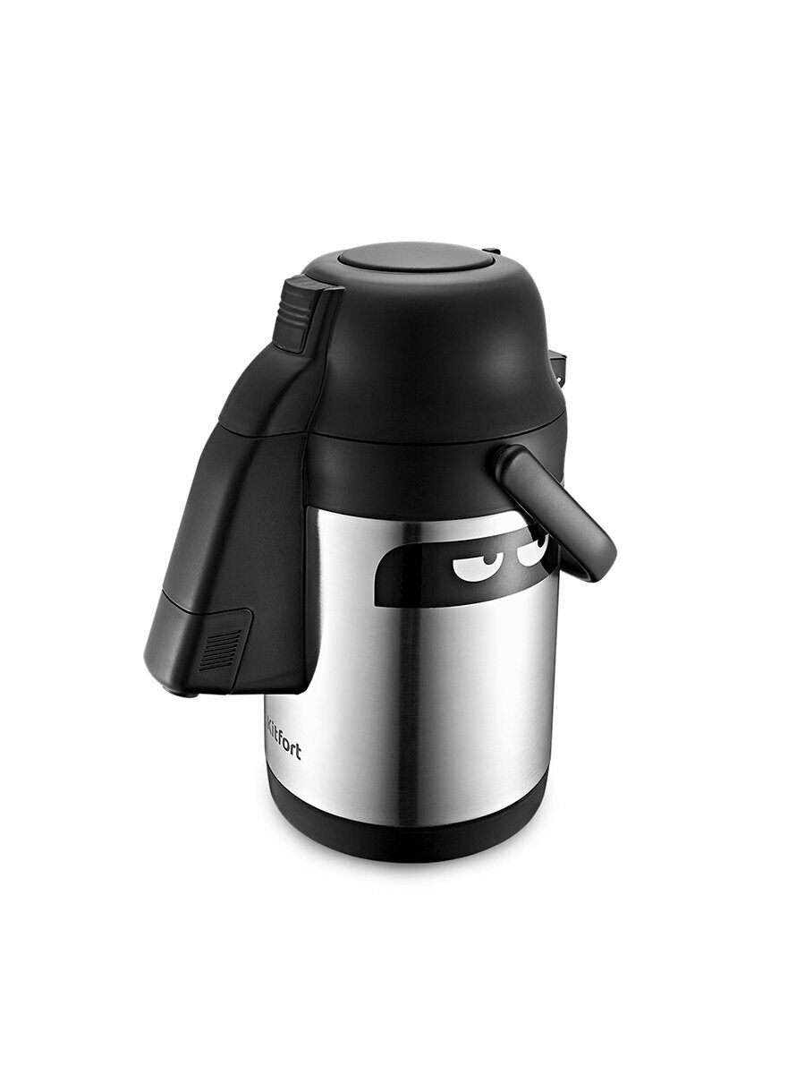 В колбе термоса находится патрубок. При нажатии на помпу вода со дна колбы попадает в носик, а затем в вашу кружку или любую другую ёмкость, которую вы установите. КТ-1236 имеет простую конструкцию, которую легко разбирать и просто мыть.