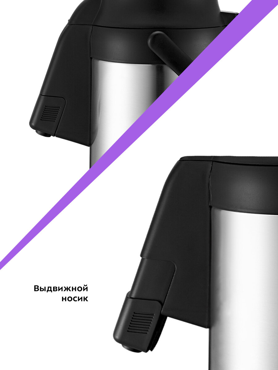 Термос с автоматической подачей воды — это удобно и безопасно. Нет риска пролить кипяток, уронить термос и обжечься. Носик можно выдвинуть вниз для более удобного налива жидкости.