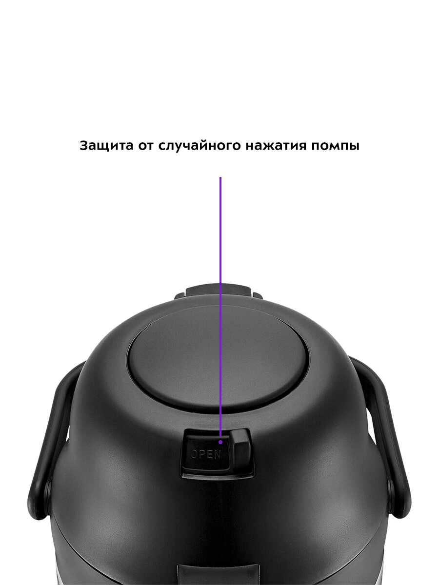 В крышку встроена помпа, которую нужно нажать, и тогда напиток польется из носика. Стопорный рычаг в крышке предохраняет от случайного нажатия на помпу.