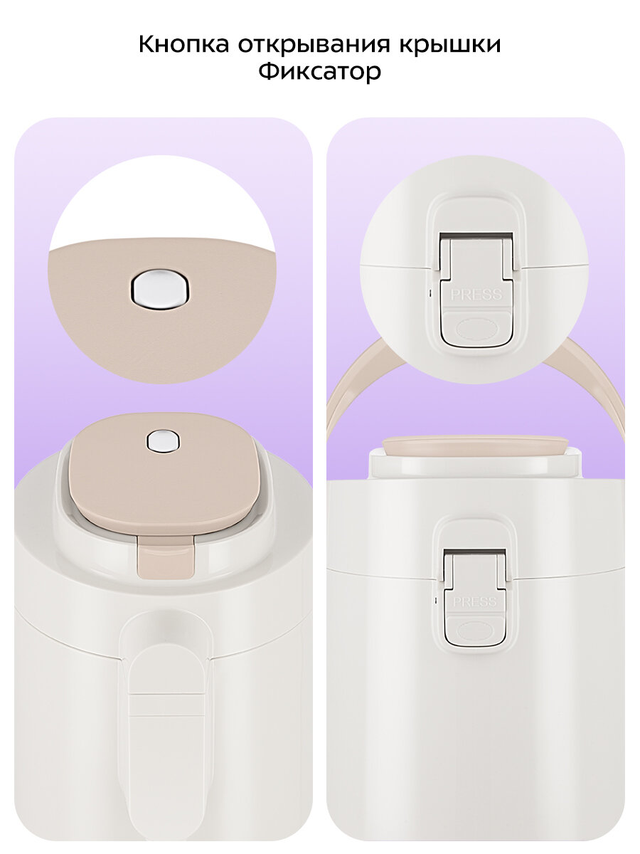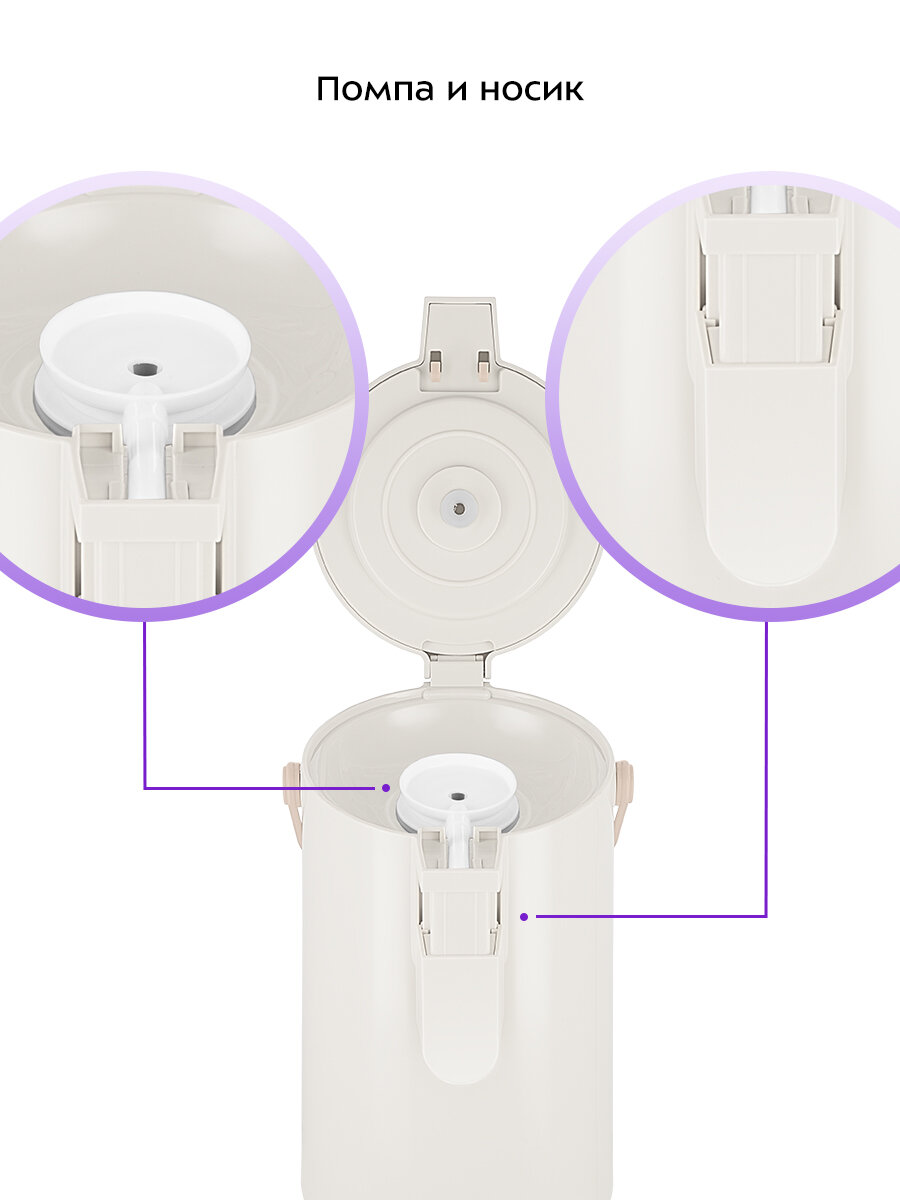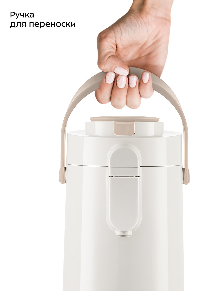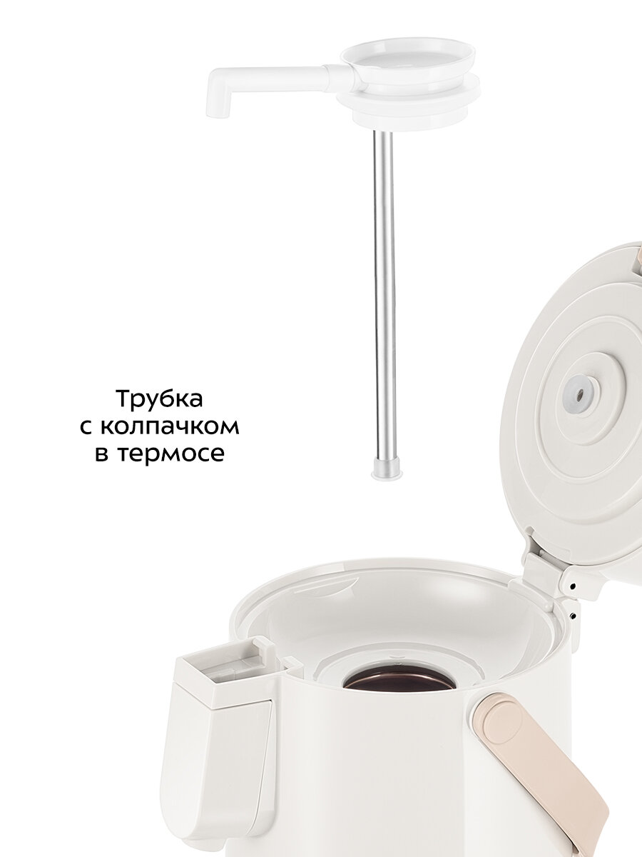 Для подачи напитка из колбы термос оборудован помпой и специальным носиком. Такая конструкция позволяет не открывать колбу при наливании жидкости, благодаря чему температура внутри колбы сохраняется дольше.
