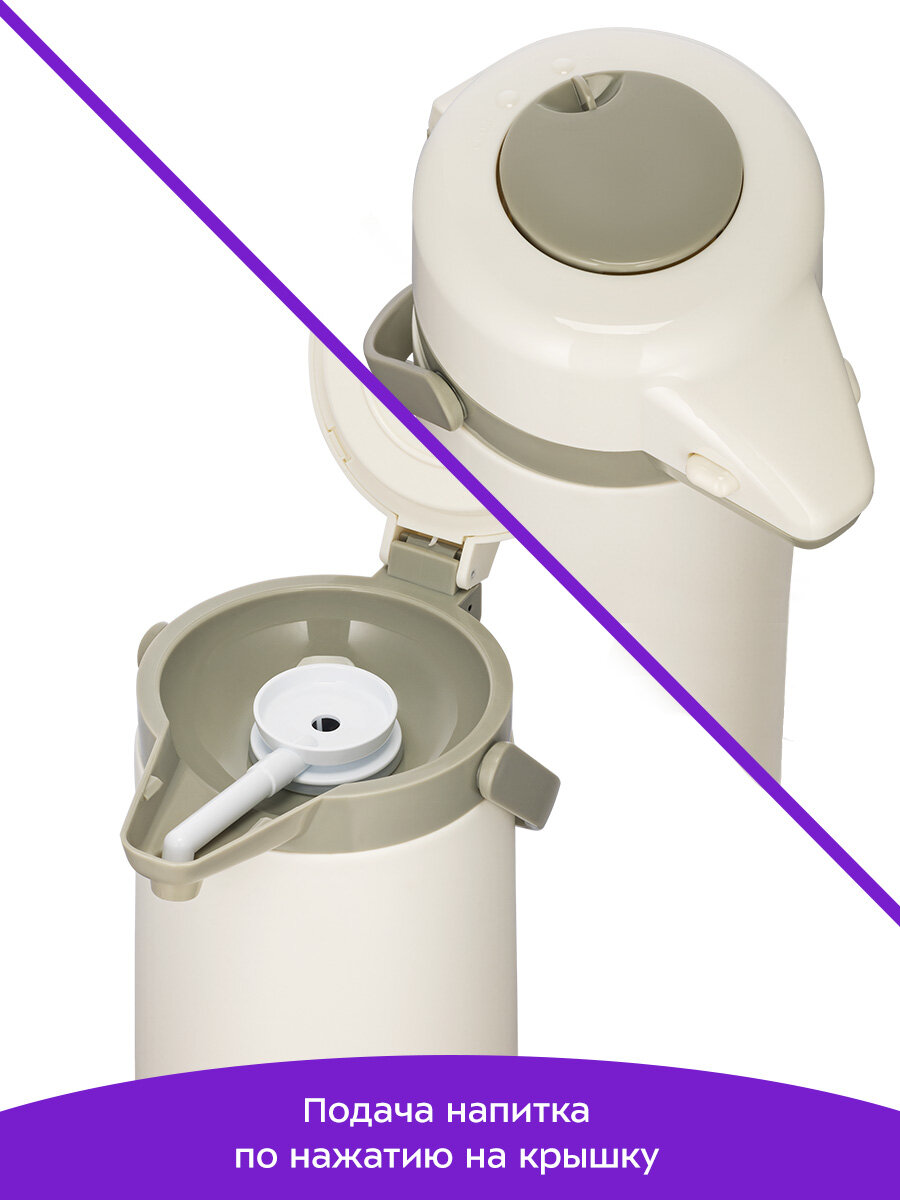 В колбе термоса находится трубка, соединённая с носиком. При нажатии на крышку внутри колбы создаётся давление воздуха, которое выталкивает жидкость в трубку, а затем в носик. При этом рычаг на крышке должен быть повернут в положение «Open».