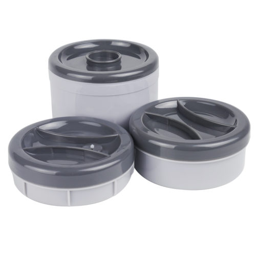 Особенности: двойные стенки, ложка и вилка в комплекте, три контейнера для продуктов