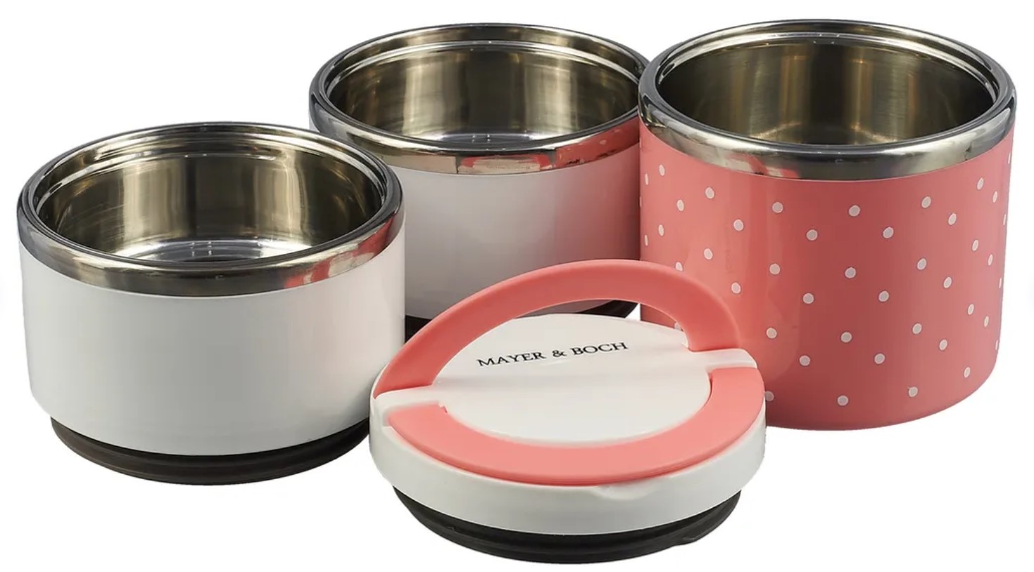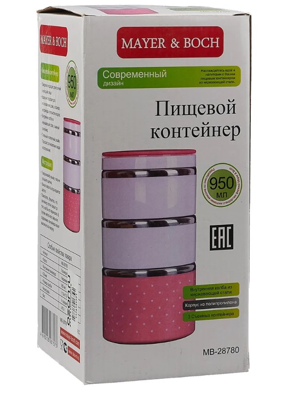 Пищевой термосMAYER&BOCH станет прекрасным дополнением к набору ваших кухонных принадлежностей. Термос предназначен для длительного хранения горячих блюд, сохраняя нужную температуру. Корпус выполнен из цветного полипропилена. Внутренний резервуар — из высококачественной нержавеющей стали, не вступающей в реакцию с продуктами и не искажающей вкус приготовленных блюд. Данный термос обладает не только прекрасными термоизоляционными качествами, но и непревзойденной надежностью. Благодаря эргономичной ручке его легко и удобно транспортировать. Крышка плотно закрывается. Это идеальный вариант для переноски нескольких разных блюд. Подходит для мытья в посудомоечной машине.