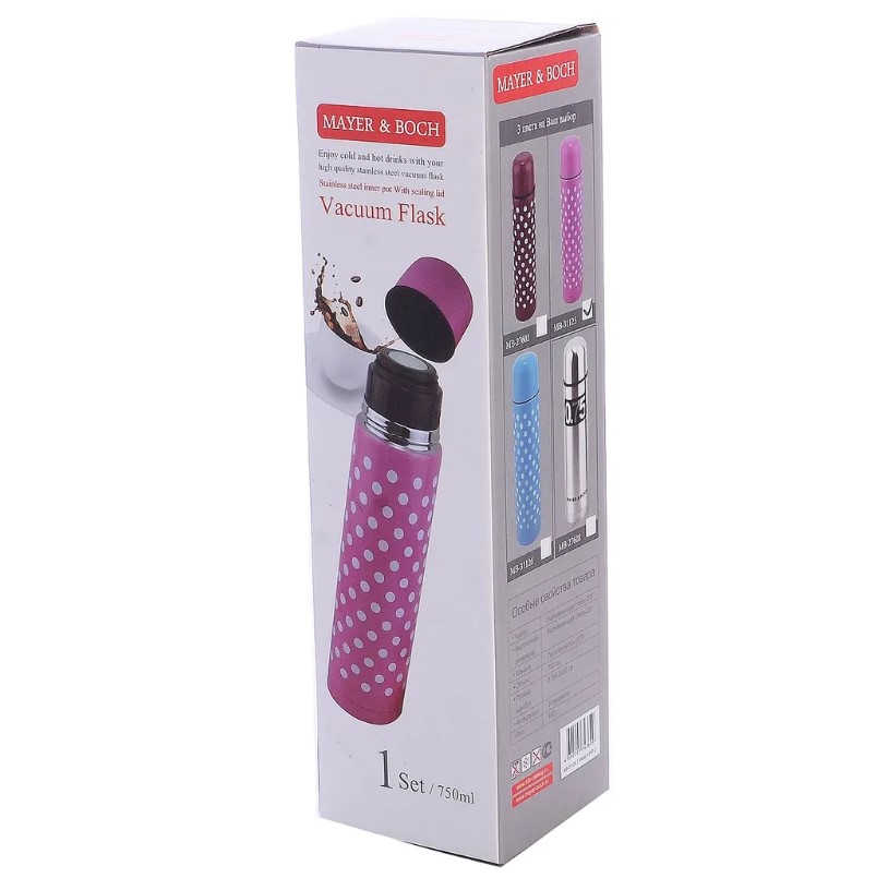 Термос MAYER&BOCH выполнен из качественной нержавеющей стали, которая не вступает в реакцию с содержимым термоса и не изменяет вкусовых качеств напитка. Двойная стенка из нержавеющей стали сохраняет температуру на срок до 6-ти часов. Вакуумный закручивающийся клапан предохраняет от проливаний. Цветное покрытие обеспечивает защиту от истирания корпуса. Данная модель термоса прочная, долговечная и в тоже время легкая. Стильный металлический термос понравится абсолютно всем и впишется в любой интерьер кухни. Легко и просто моется.