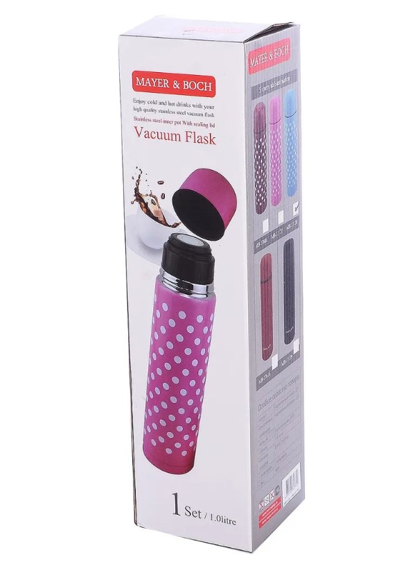 Термос MAYER&BOCH выполнен из качественной нержавеющей стали, которая не вступает в реакцию с содержимым термоса и не изменяет вкусовых качеств напитка. Двойная стенка из нержавеющей стали сохраняет температуру на срок до 6-ти часов. Вакуумный закручивающийся клапан предохраняет от проливаний. Цветное покрытие обеспечивает защиту от истирания корпуса. Данная модель термоса прочная, долговечная и в тоже время легкая. Стильный металлический термос понравится абсолютно всем и впишется в любой интерьер кухни. Легко и просто моется.