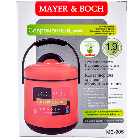 Пищевой термос MAYER&BOCH станет прекрасным дополнением к набору ваших кухонных принадлежностей. Термос предназначен для длительного хранения горячих блюд, сохраняя нужную температуру до 5-ти часов. Цветной корпус выполнен из полипропилена. Внутренний резервуар и контейнер для еды - из высококачественной нержавеющей стали, не вступающей в реакцию с продуктами и не искажающей вкус приготовленных блюд. Вилка и ложка из стали. Данный термос обладает не только прекрасными термоизоляционными качествами, но и непревзойденной надежностью. Благодаря большой и эргономичной ручке его легко и удобно транспортировать. В комплекте: термос, крышка, контейнер с крышкой, 1 вилка, 1 ложка. Подходит для мытья в посудомоечной машине.