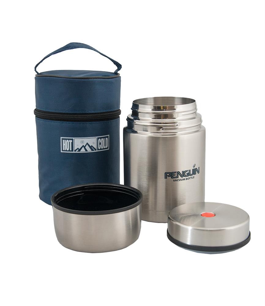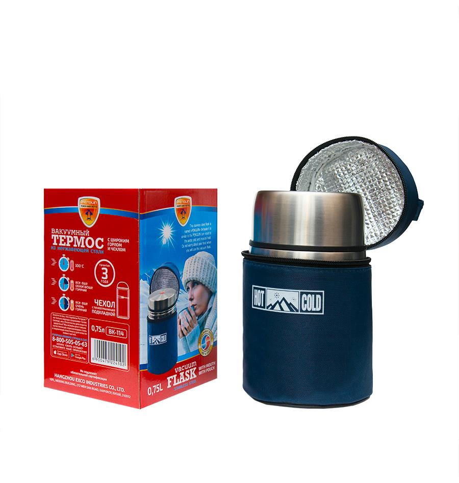 Термос имеет широкое горло диаметром 85 мм и снабжен глухой, термоизолированной пробкой. Из-за широкого горла, вторые блюда можно есть прямо из термоса, не перекладывая в тарелку. Чехол этого термоса выполняет не только защитно-декоративную функцию, но и помогает сохранить температуру. Наличие чехла прибавляет 2-4 градуса дополнительной температуры.