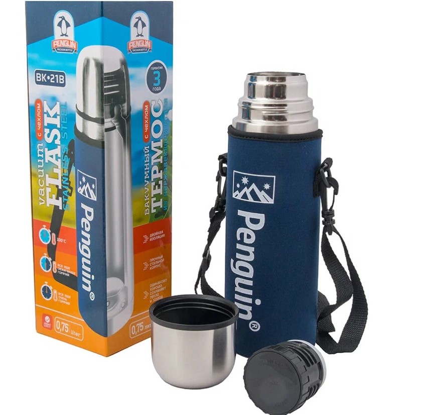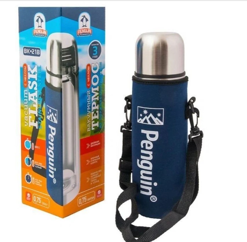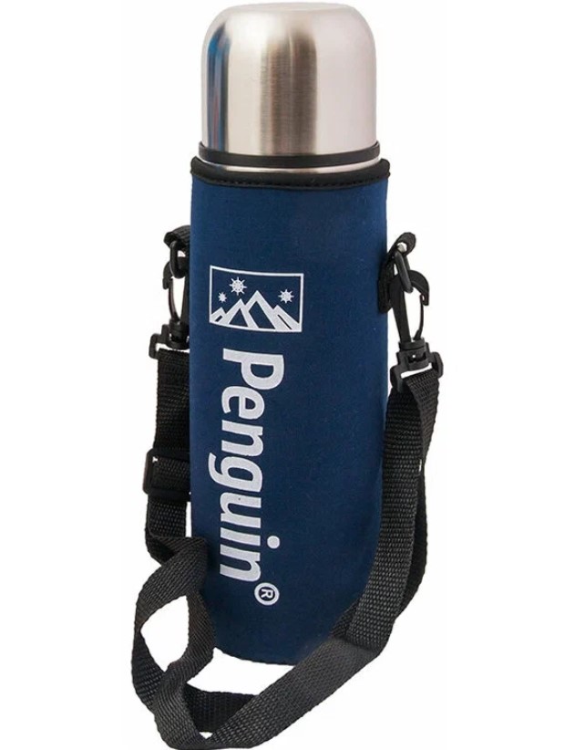 Термос для напитков с узким горлом объемом 0,75 л с глухой пробкой с толстым неопреновым чехлом.