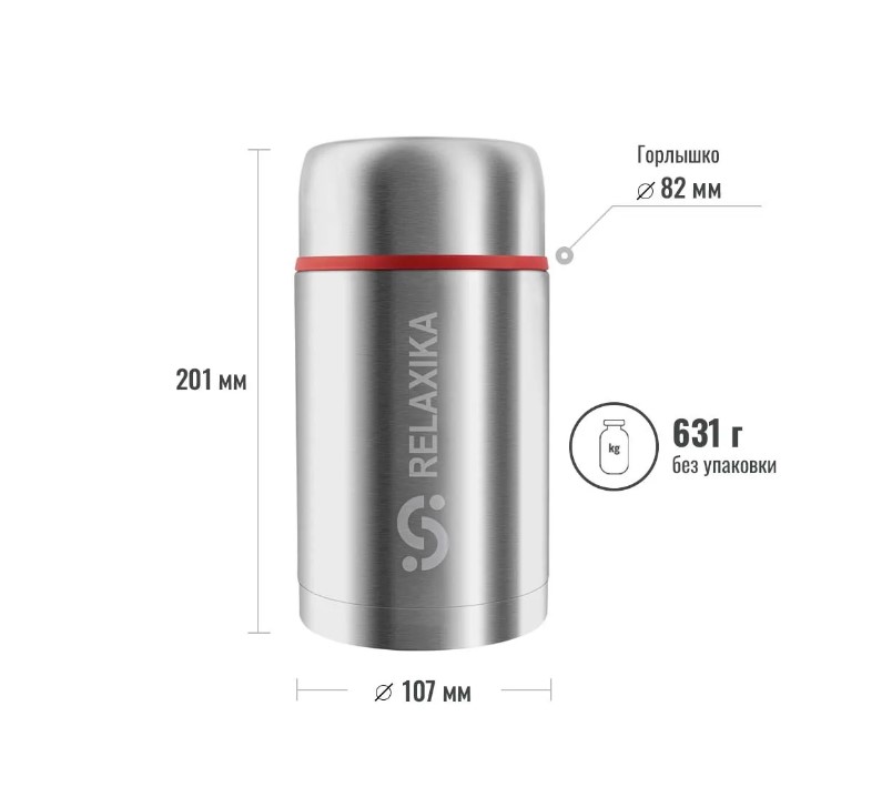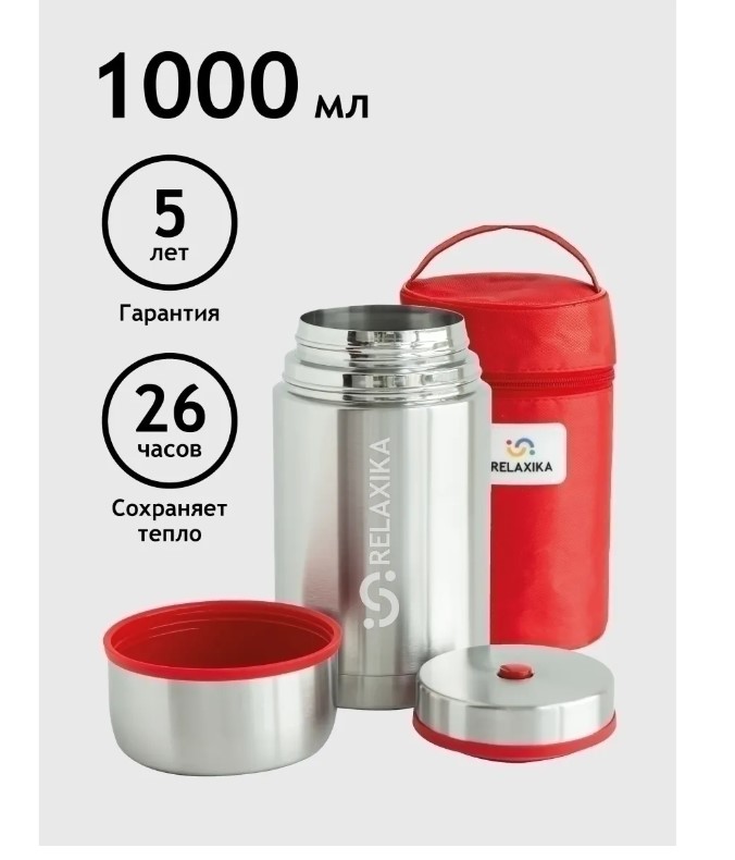 Металлический термос 1 литр для еды с широким горлом Relaxika выполнен из высококачественной нержавеющей стали и пищевого пластика. В отличии от термоса со стеклянной колбой, термос из нержавеющей стали устойчив к ударам и повреждениям и легок в эксплуатации. Благодаря широкому горлышку можно есть прямо из термоса, либо использовать крышку как тарелку. Термос будет особенно полезен во время отдыха на природе, в качестве посуды. Его по достоинству оценят любители туризма и походов, он станет центральным элементом походной кухни (рыболовного лагеря). Также термос для супа и еды в чехле будет особенно полезен охотникам и рыболовам. В комплекте термочехол, который увеличивает время сохранения тепла, благодаря чему подойдет для похода на тренировку или в школу, поездки на дачу или на работу. Компактный размер и легкий вес делает термос возможным для использования даже ребенком, удобно брать еду ребенку на прогулку или давать с собой на экскурсию.
