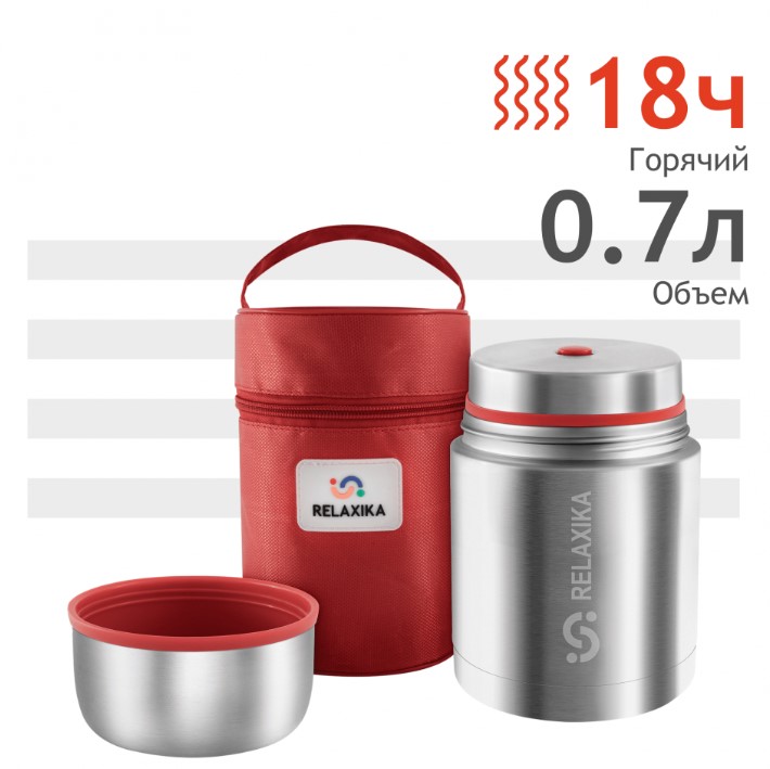 Металлический термос для еды с широким горлом 0,7 литра Relaxika выполнен из высококачественной нержавеющей стали и пищевого пластика. В отличии от термоса со стеклянной колбой, термос из нержавеющей стали устойчив к ударам и повреждениям и легок в эксплуатации. Благодаря широкому горлышку можно есть прямо из термоса, либо использовать крышку как тарелку. Термос будет особенно полезен во время отдыха на природе, в качестве посуды. Его по достоинству оценят любители туризма и походов, он станет центральным элементом походной кухни (рыболовного лагеря). Также термос для супа и еды в чехле будет особенно полезен охотникам и рыболовам. В комплекте термочехол, который увеличивает время сохранения тепла, благодаря чему подойдет для похода на тренировку или в школу, поездки на дачу или на работу. Компактный размер и легкий вес делает термос возможным для использования даже ребенком, удобно брать еду ребенку на прогулку или давать с собой на экскурсию.