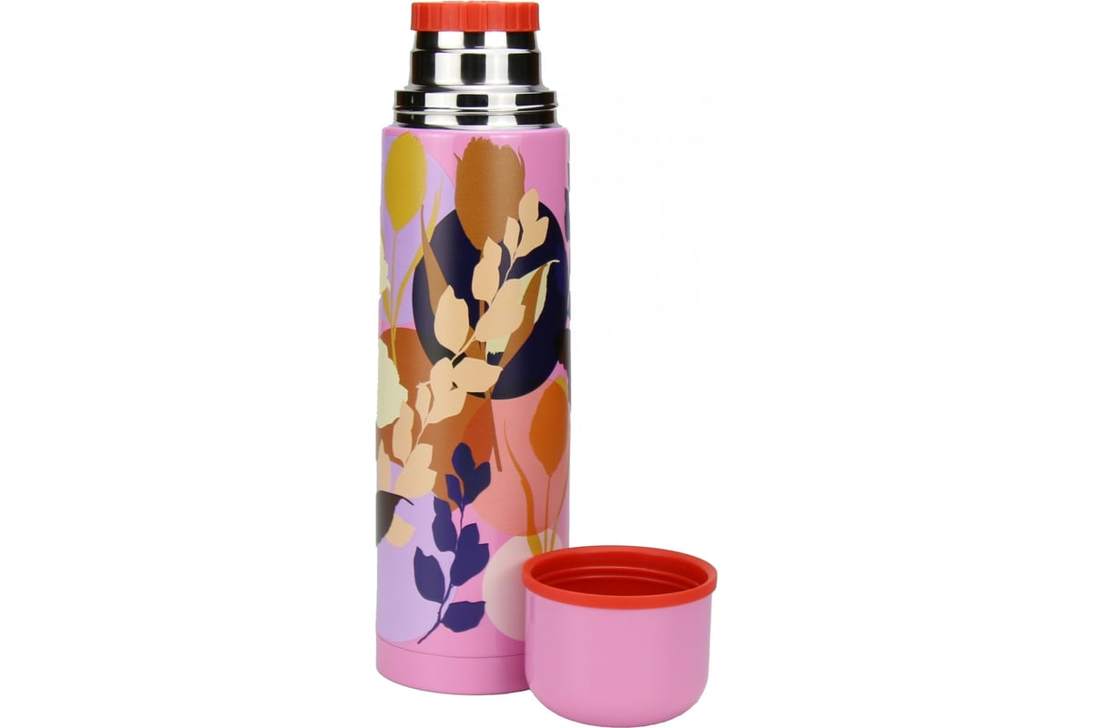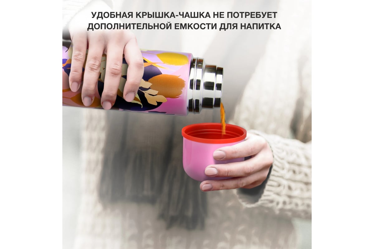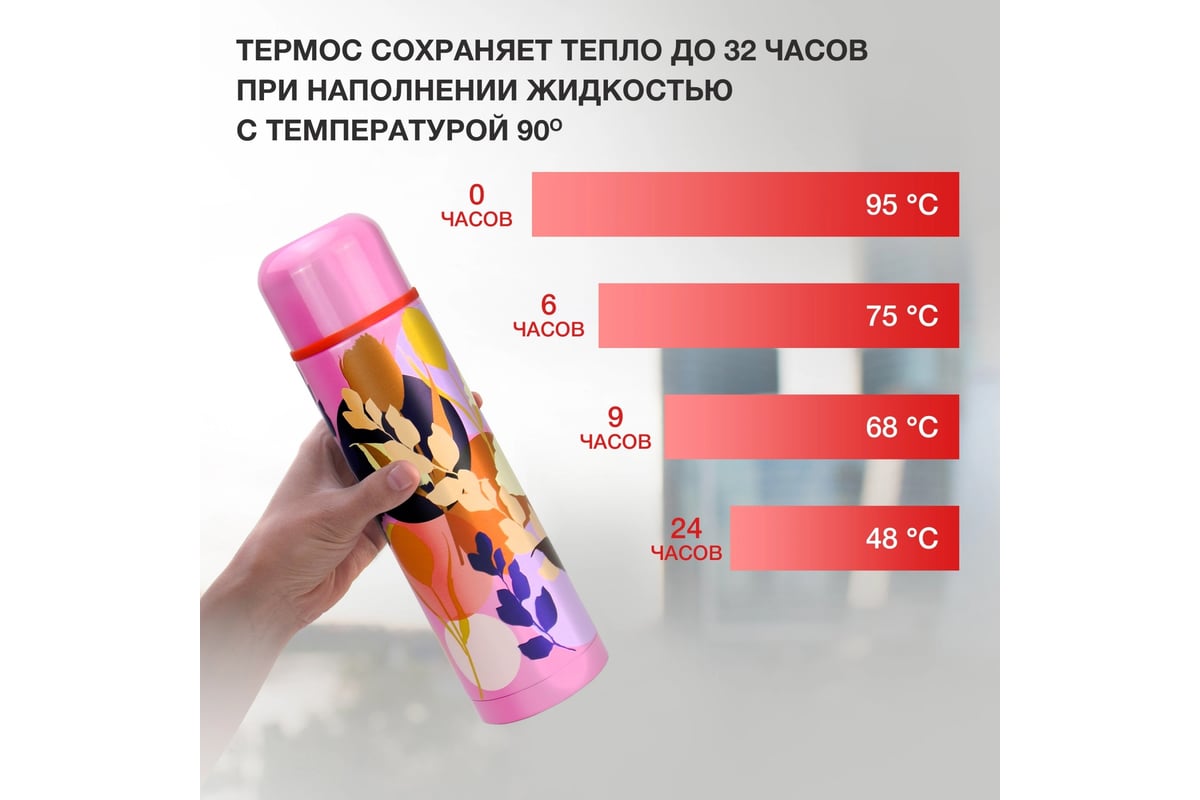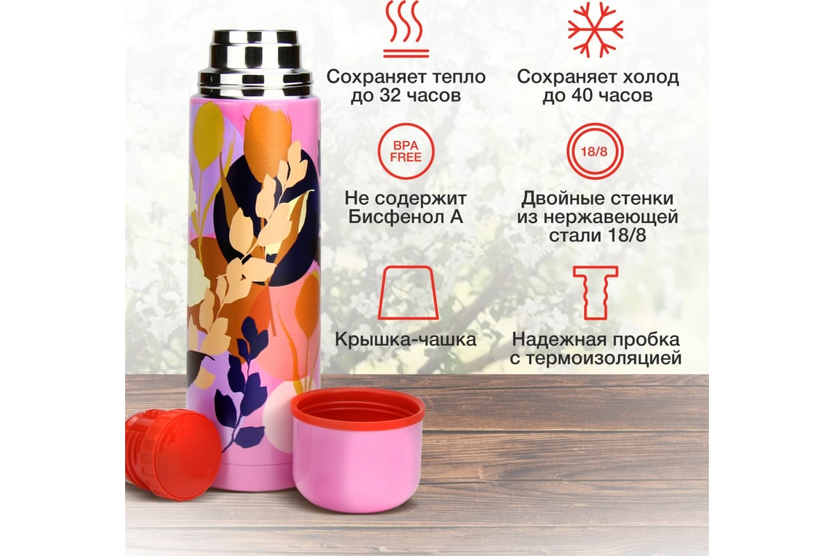 Стильный дизайн. Термос выглядит современно и привлекает внимание приятным рисунком с цветочными силуэтами.