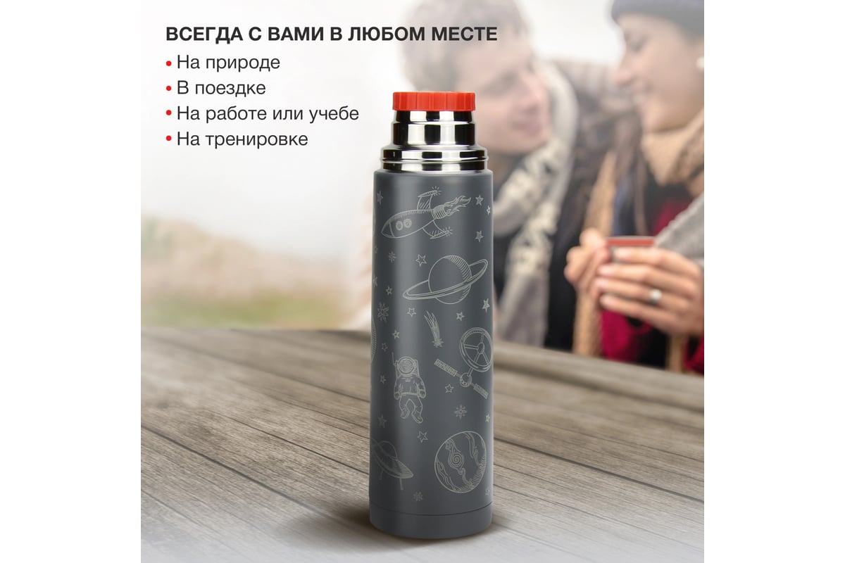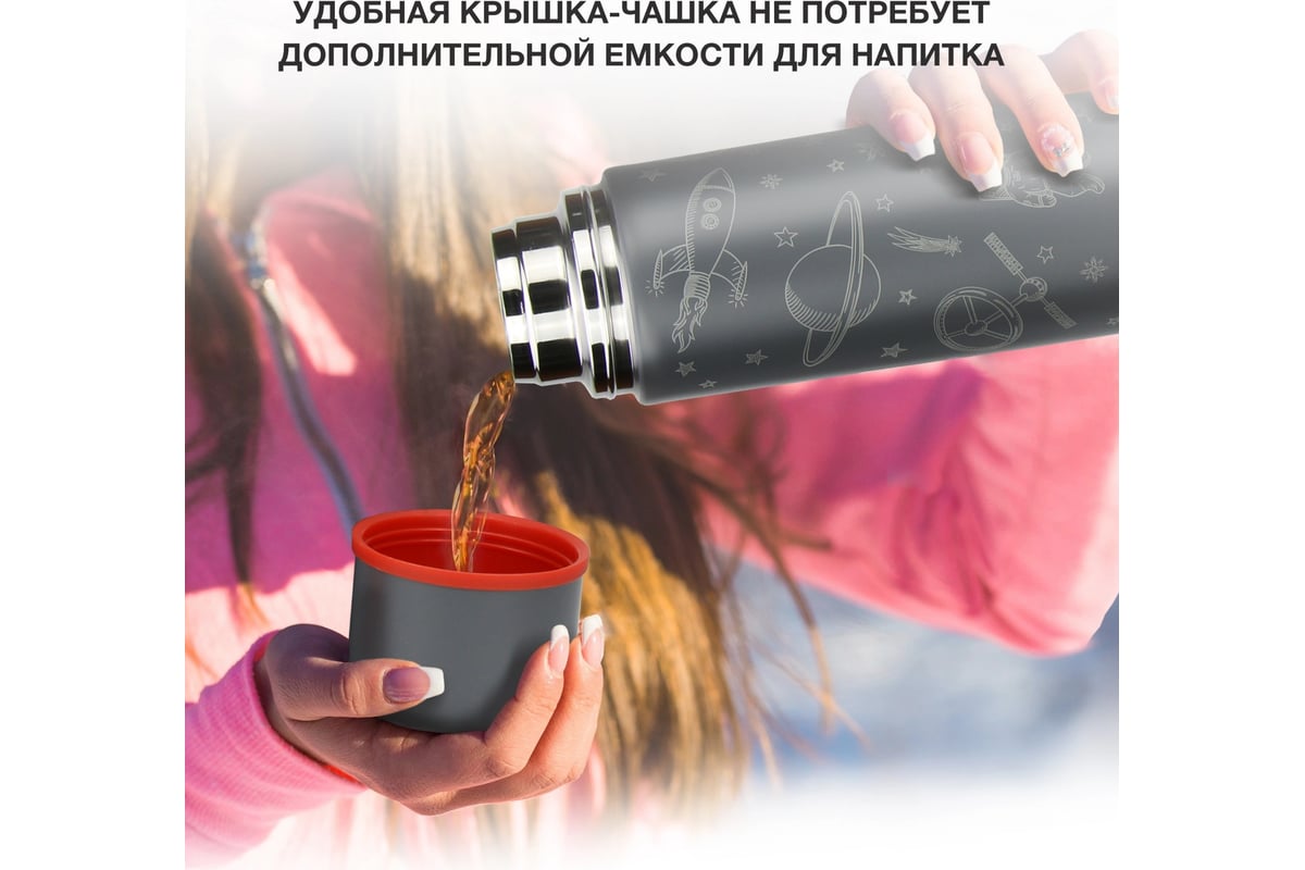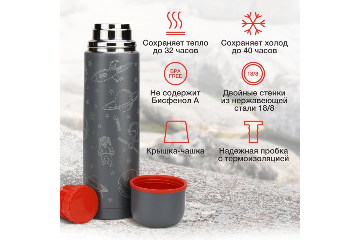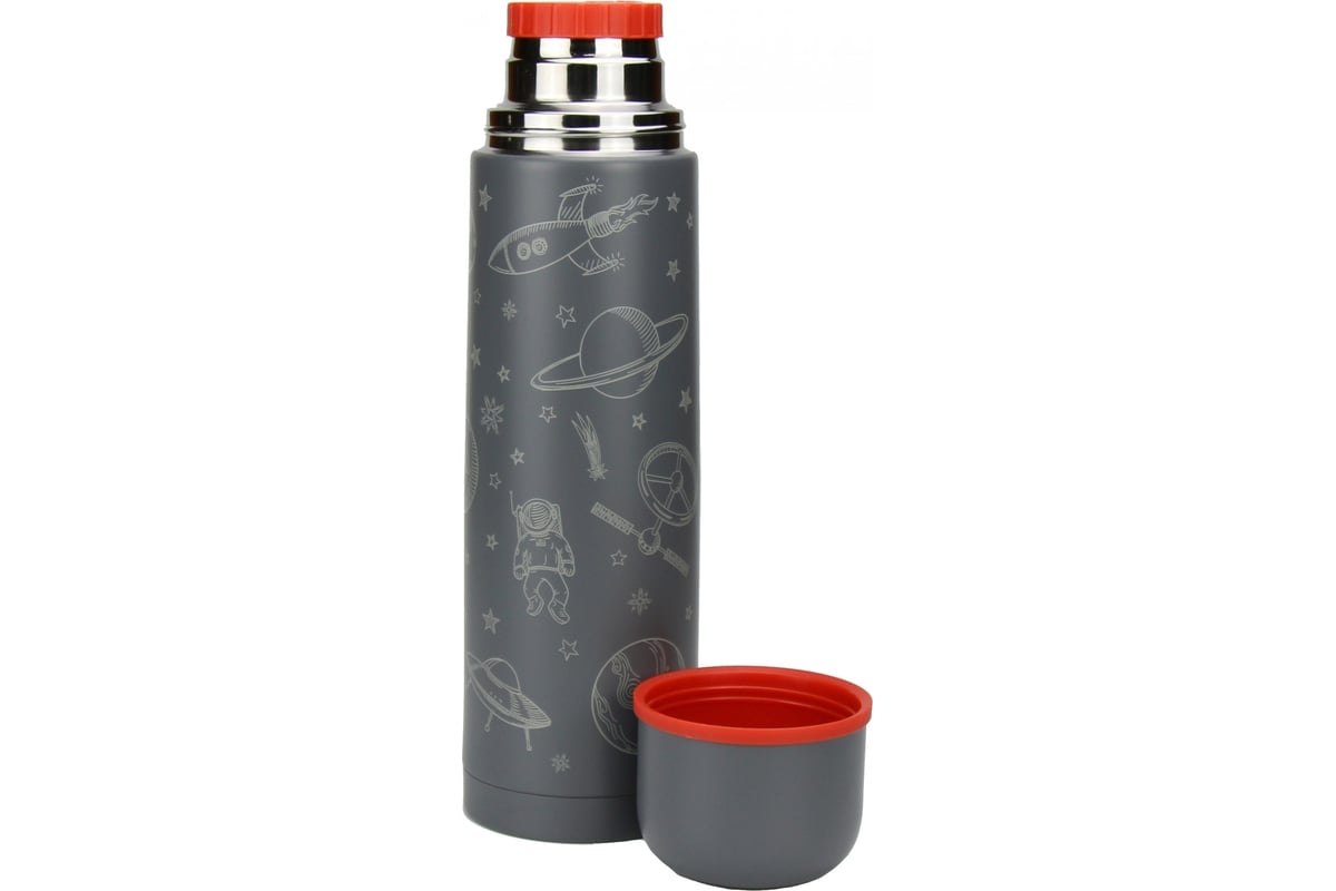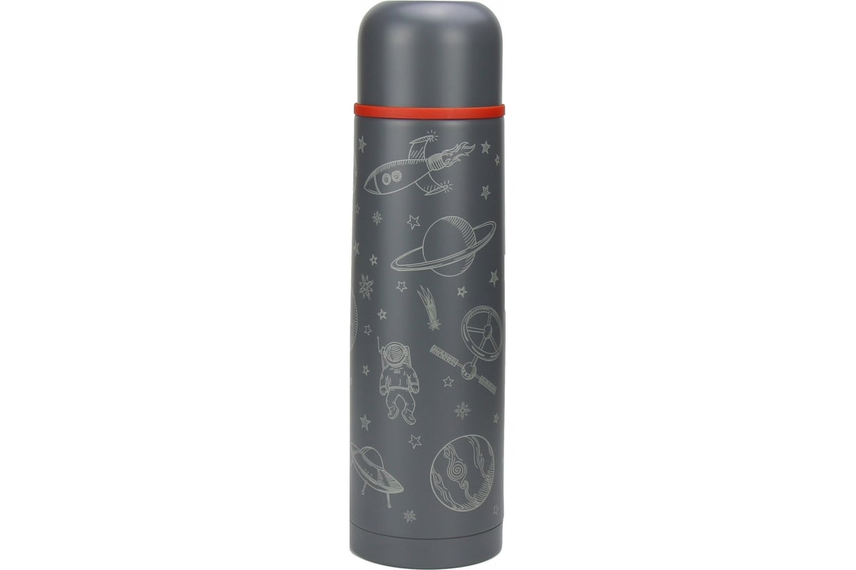 Стильный дизайн. Термос выглядит современно и привлекает внимание серебристо-серым принтом на космическую тематику.