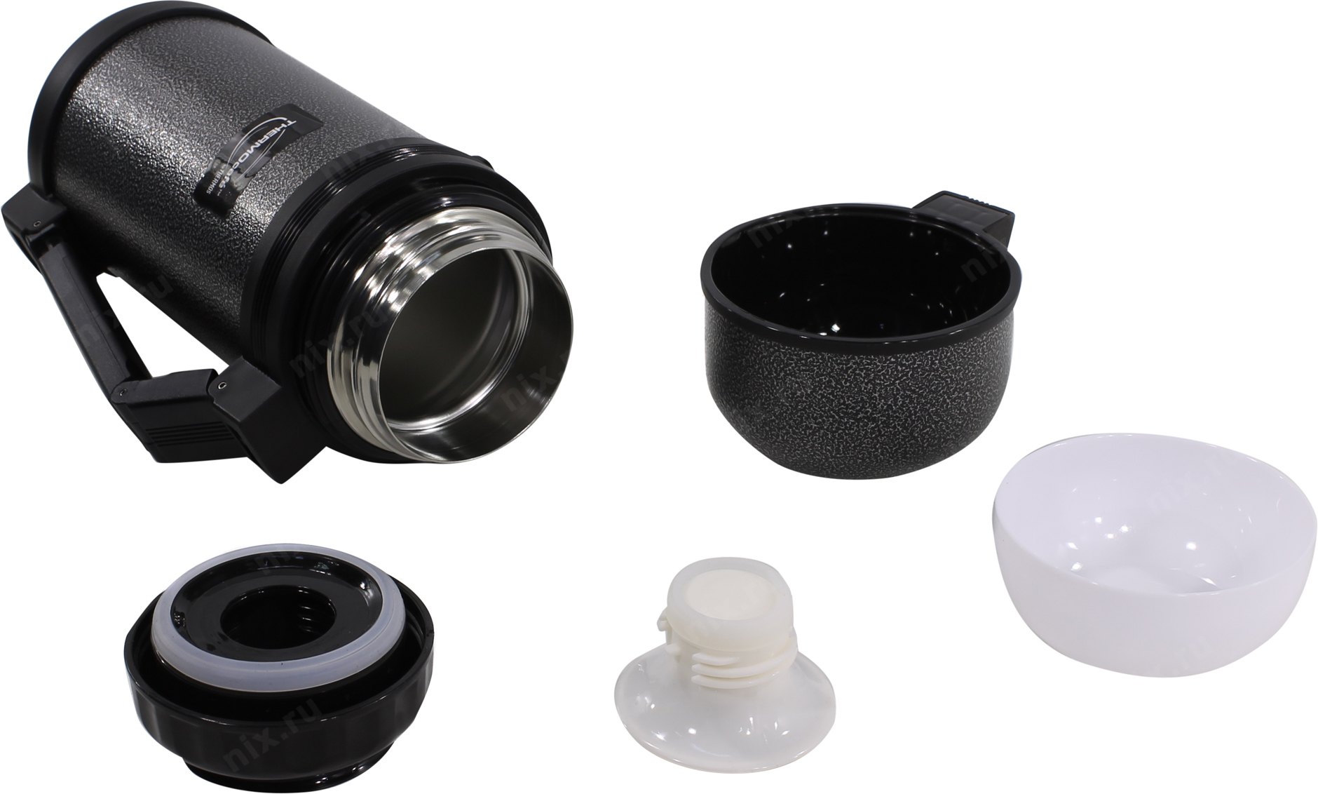 Описание: Комбинированное горло термоса для еды и напитков. Крышка может использоваться как чашка или блюдце. В комплекте под крышкой - пластиковая чашка. Объем термоса дает возможность сохранять еду или напитки на двоих. В комплекте к термосу прилагает съемная ручка, что позволяет носить его на плече.