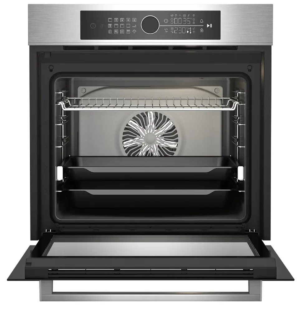 Особенности духовки, плиты: Быстрый нагрев, Вентилятор охлаждения, Встроенные часы, Двухуровневое приготовление, Дисплей, Доводчик дверцы духовки, Полностью стеклянная внутренняя дверца, Хромированные направляющие