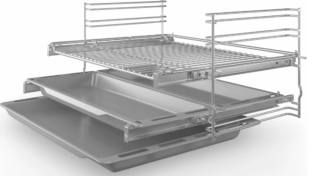 Удобный и безопасный доступ к блюдам на противнях благодаря плавно выдвигающимся телескопическим направляющим на 2 уровнях.