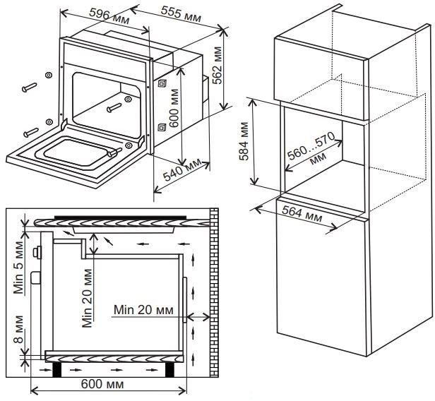 | | Дверца | | Открывание | сверху вниз | | Кол-во стекол дверцы | 2 |  |  | | Общее | | Направляющие противней | решетчатые | | Класс энергопотребления | A | | Мощность подключения | 3.1 кВт | | Габариты (ВхШхГ) | 60x59.6x54 см | | Размеры для встраивания (ВхШхГ) | 584x564x560 мм |