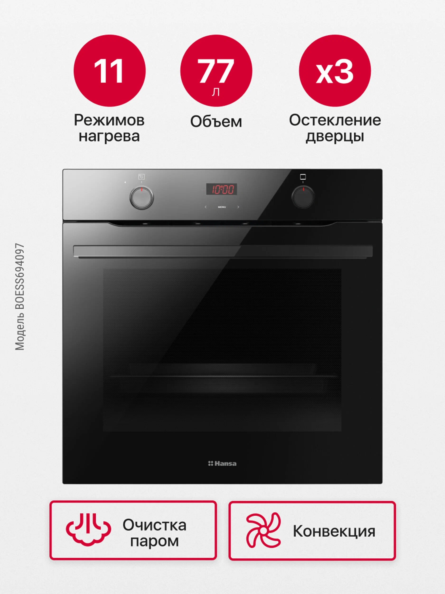 сетевой шнур 1.5м, очистка паром Aqualytic, функция пара Soft Steam, Baking Pro System, доводчик дверцы; тип часов: электронные