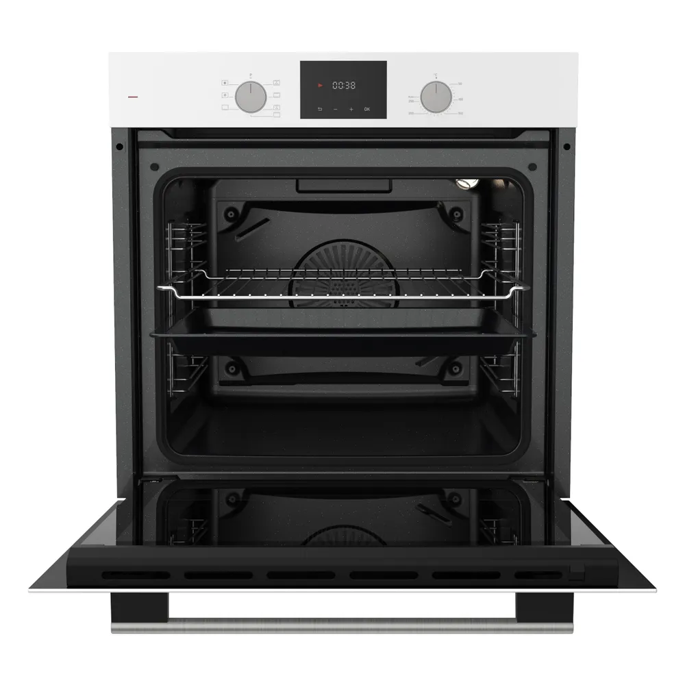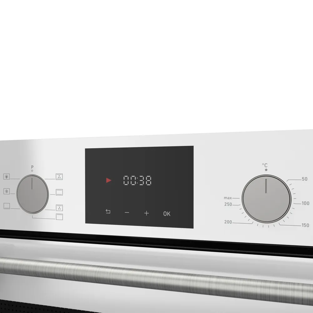 Особенности духовки, плиты: Вентилятор охлаждения, Встроенные часы, Двухуровневое приготовление, Дисплей, Защитное покрытие от отпечатков пальцев, Полностью стеклянная внутренняя дверца, Хромированные направляющие