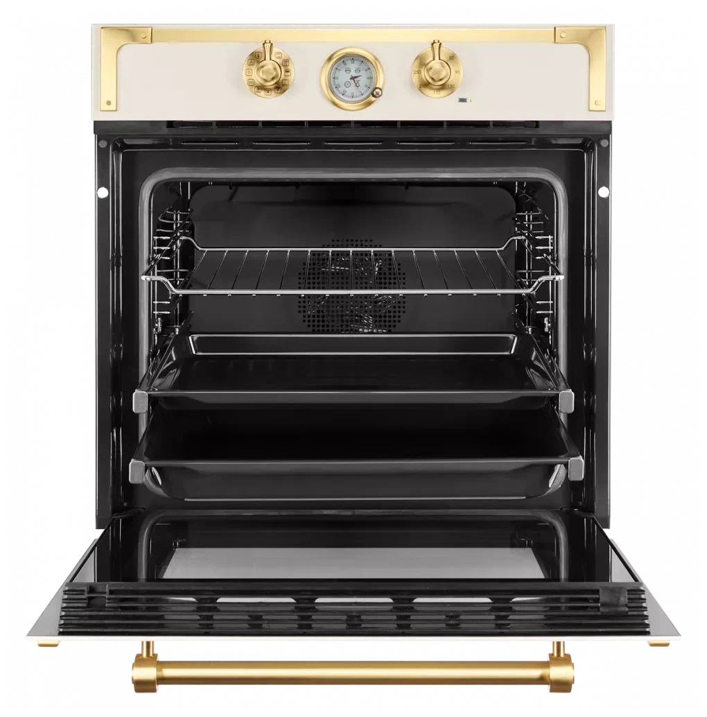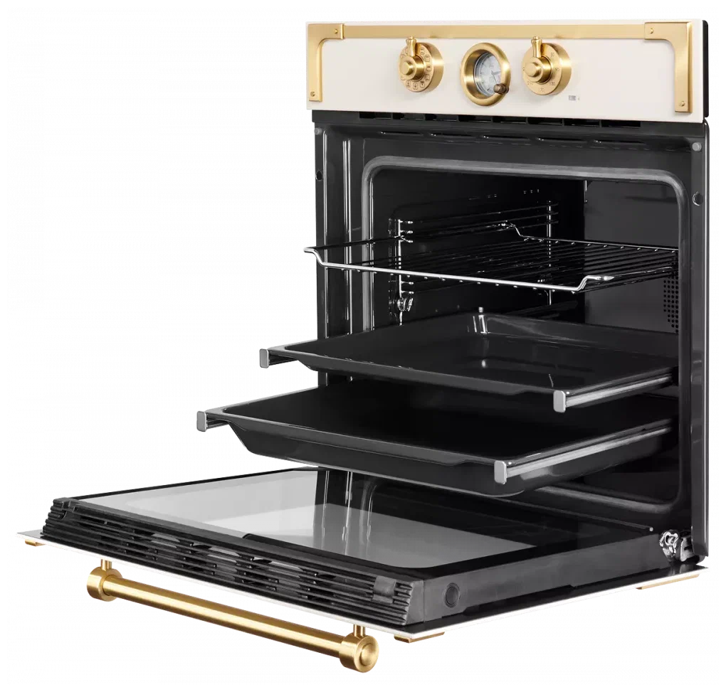быстрый нагрев, Вентилятор охлаждения, Встроенные часы, Доводчик дверцы духовки, Хромированные направляющие