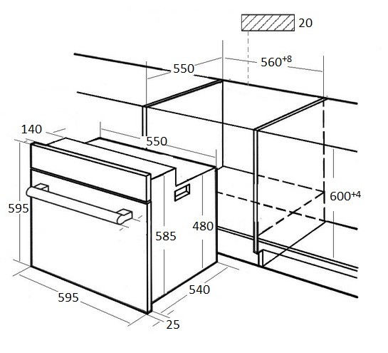 | | Общее | | Очистка внутренней поверхности | каталитическая / задняя стенка / | | Направляющие противней | телескопические на двух уровнях | | Открывание | сверху вниз | | Автодоводчик дверцы |  | | Кол-во стекол дверцы | 2 | | Защита от детей |  | | Класс энергопотребления | A | | Мощность подключения | 2.95 кВт | | Габариты (ВхШхГ) | 59.5x59.5x56.5 см | | Размеры для встраивания (ВхШхГ) | 604x568x550 мм |