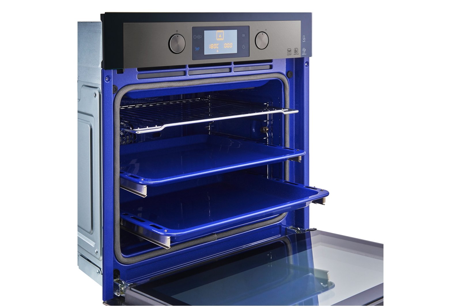 - одна телескопическая направляющая, вес 34 кг, линейный контроль температуры, приложение для смартфонов на Андроид «LG Smart Oven Global» (рецепты и cамодиагностика); глубокий противень, противень для выпечки