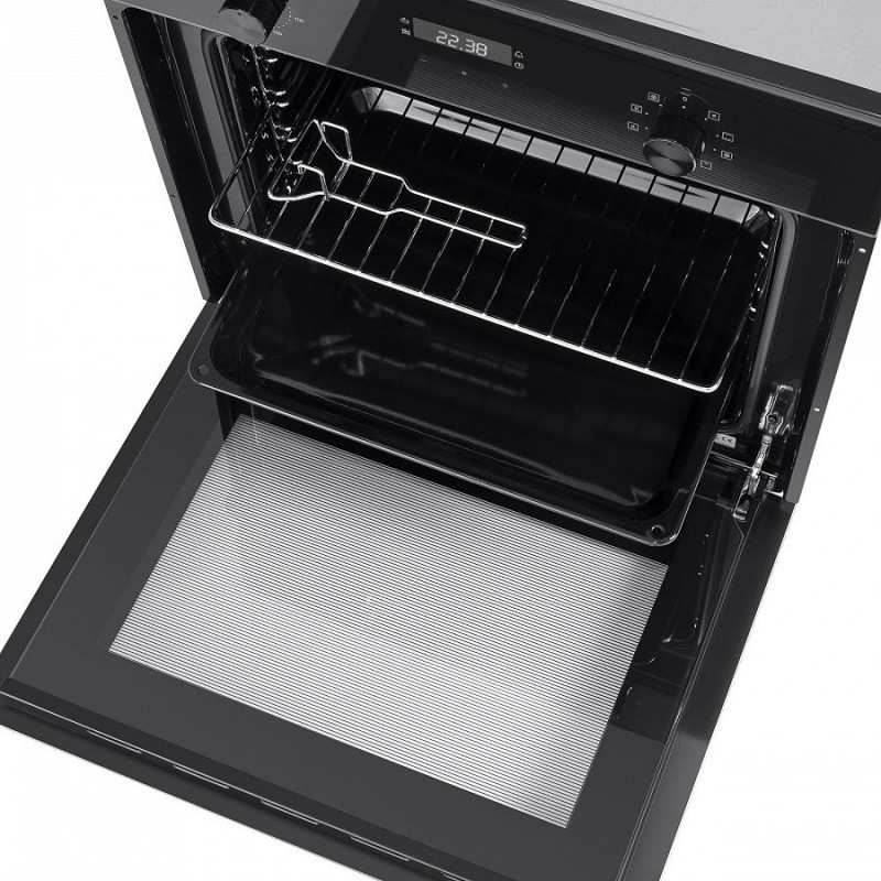 Особенности: Трамп-линии на внутреннем стекле дверцы, боковые направляющие, программатор: электронный сенсорный, духовой шкаф оснащен тяжелыми, цельнометаллическими ручками управления и ручкой дверцы, в отделке лицевой части блока управления применяется жаропрочное стекло.
