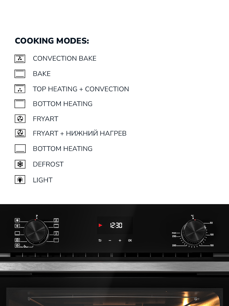 Традиционный нагрев + конвекция, Традиционный нагрев, Верхний нагрев+конвекция, Верхний нагрев, Fly to fry (F2F), Fly to fry + нижний нагрев, Нижний нагрев, Размораживание, Свет