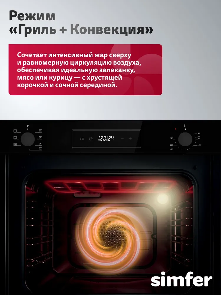 Режимы работы: Гриль, Гриль + конвекция, Конвекция, Нижний нагрев + конвекция