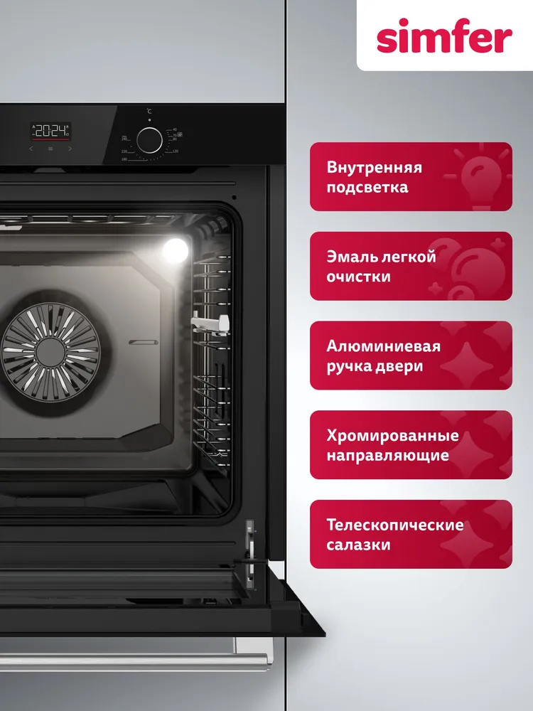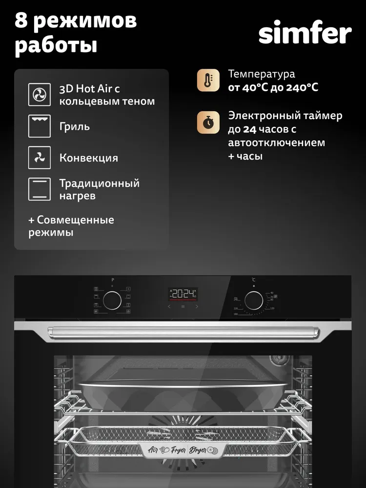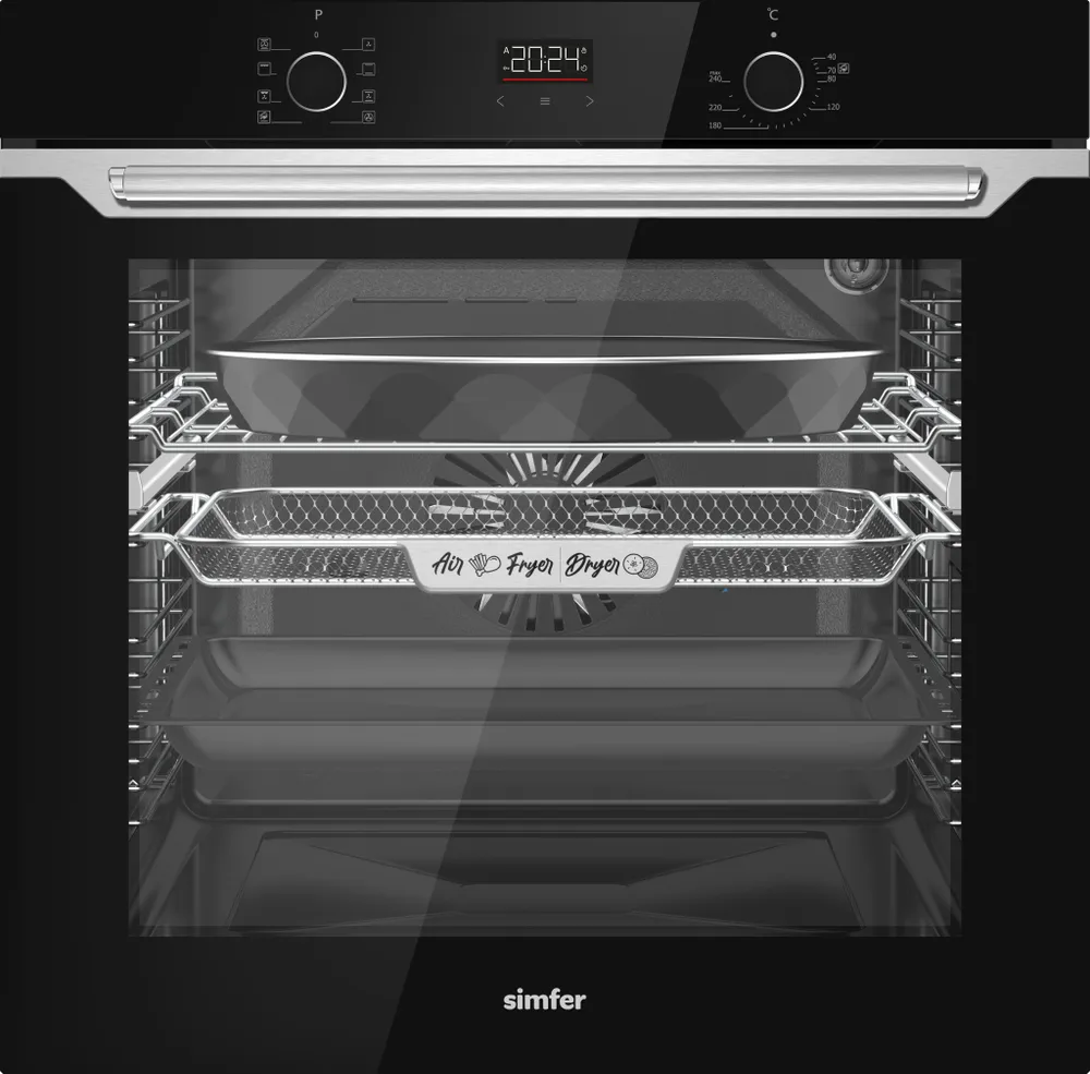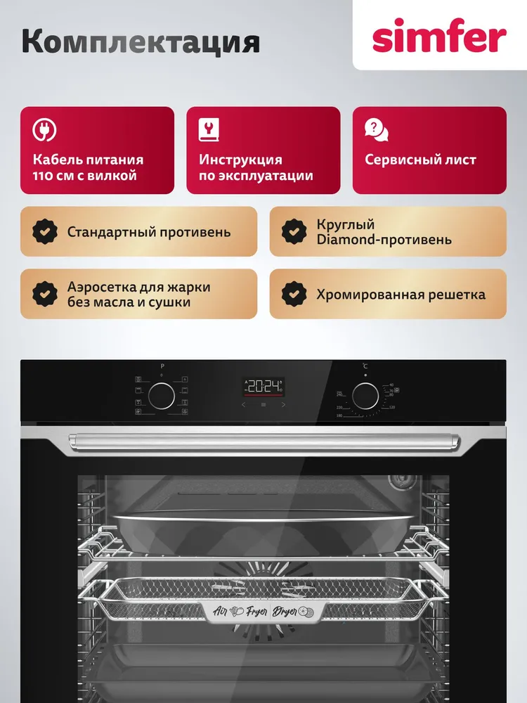 стандартный противень с антипригарным покрытием; хромированная решётка; круглый противень; инструкция по эксплуатации; гарантийный талон
