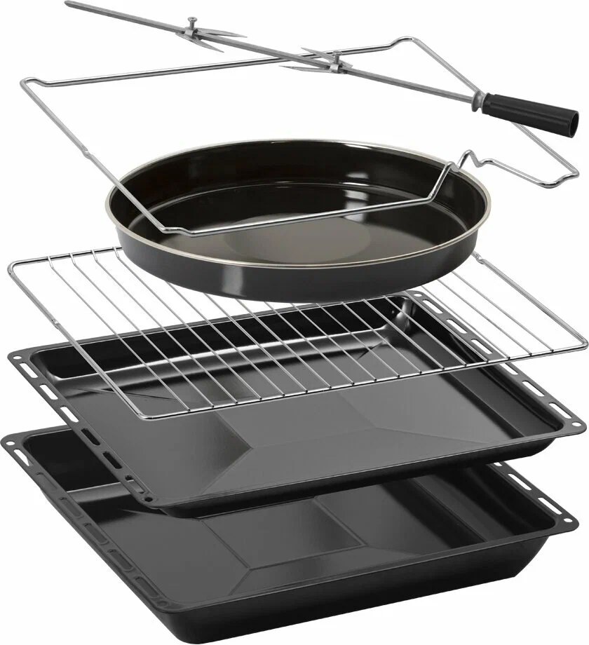 Вертел,1 стандартный + 1 глубокий противень с антипригарным покрытием, хромированная решётка, форсунки для сжиженного газа G30/30, руководство по эксплуатации