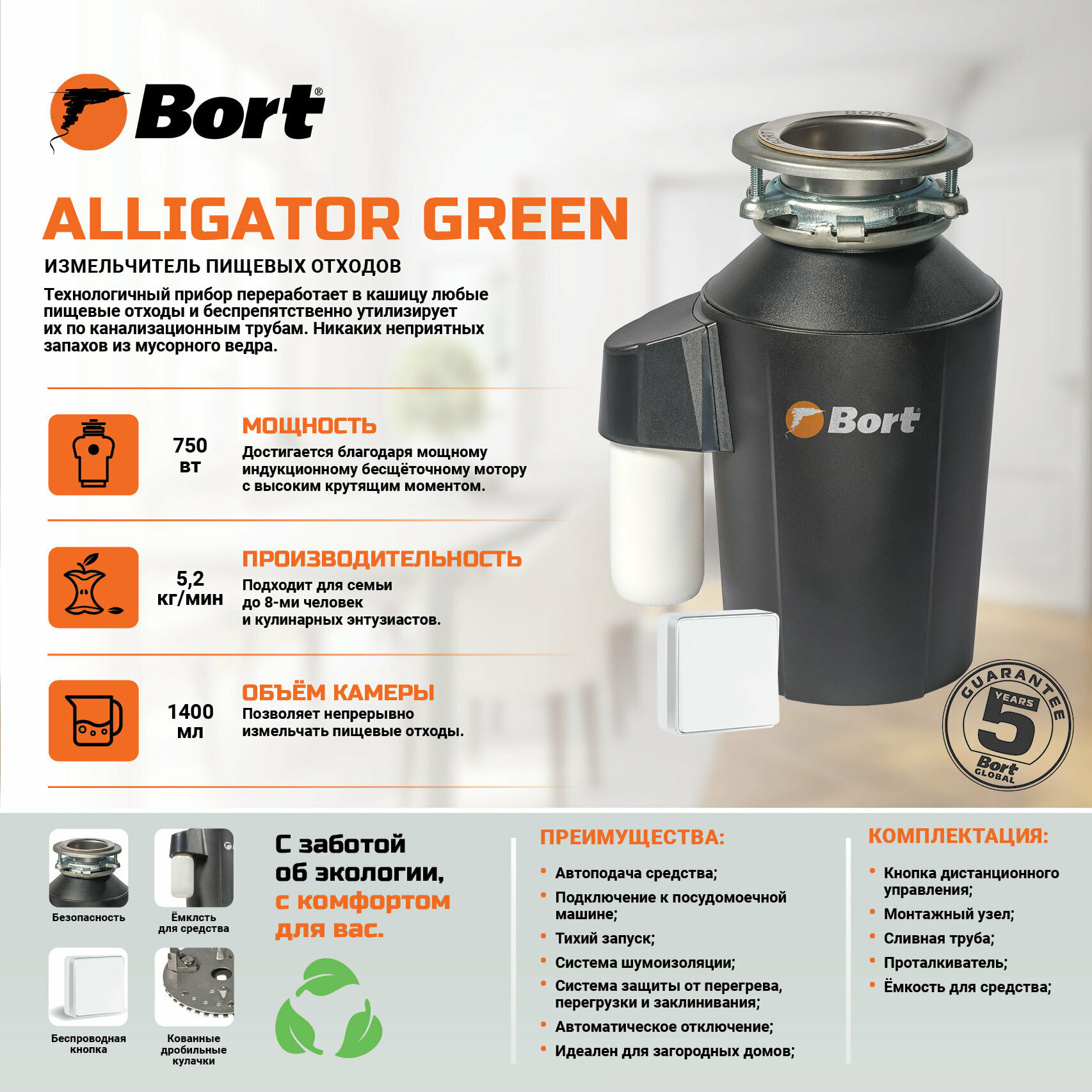 Измельчитель пищевых отходов Bort Alligator Green представляет собой высококачественное устройство, разработанное для эффективного устранения пищевых отходов на кухне. Этот современный и надежный девайс поможет вам легко и гигиенично утилизировать остатки еды, сэкономив ваше время и снизив количество отходов в домашней или коммерческой кухне, избежать неприятного запаха из мусорного ведра и сократить количество выноса мусора. Особенностью данной модели является дополнительная съемная многоразовая емкость в которую можно заливать любого рода жидкости, моющие средства или отдушки, а также жидкие или разведенные в воде био бактерии для канализации, поэтому данный измельчитель идеально подходит для загородных домов с автономной канализацией. Измельчитель оснащен мощным индукционным двигателем, способным без труда перемалывать пищевые отходы различной консистенции и даже кости. Благодаря своей высокой производительности, он позволяет быстро измельчить и переработать остатки пищи, такие как фрукты, овощи, мясо, рыба, кости и другие органические отходы. Bort Alligator Green оснащен удобным беспроводным выключателем с 2 клавишами, запуск измельчителя и запуск измельчителя с подачей раствора из емкости, который делает его использование максимально простым и безопасным. Благодаря своему компактному и элегантному дизайну, измельчитель пищевых отходов Bort Alligator Green прекрасно впишется в любой интерьер кухни. Он легко монтируется на раковину, что делает его удобным в использовании. Этот измельчитель пищевых отходов не только устраняет неприятные запахи и бактерии из мусорного ведра, но также помогает сократить объем мусора, который отправляется на свалку. Таким образом, он не только является удобным и практичным инструментом, но и дружественным к окружающей среде. Если вы стремитесь к удобству, гигиене и заботе о природе, измельчитель пищевых отходов Bort Alligator Green представляет собой идеальное решение для вашей кухни. Он обеспечивает эффективную обработку пищевых отходов в домашних условиях, позволяя вам экономить время и контролировать количество производимого мусора.
