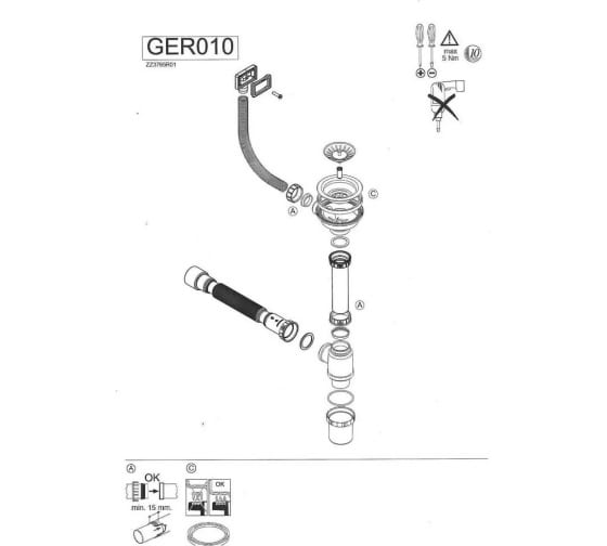 Мойка укомплектована итальянским сифоном с прямоугольным переливом WISENT GER010 и гофротрубой.
