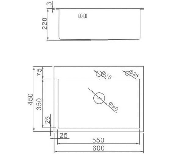 Размер мойки: ширина 60 см, глубина 45 см, высота 22 см. Размер чаши: ширина 55 см, глубина 35 см, высота 20 см. Минимальный размер отверстия в столешнице для врезной установки: ширина 57 см, глубина 43 см. В связи с особенностями производства в геометрии мойки допустимо расхождение 1-3мм. Мойка устанавливается на герметик и прижимается грузом. При данном способе установки края будут плотно прилегать к столешнице.