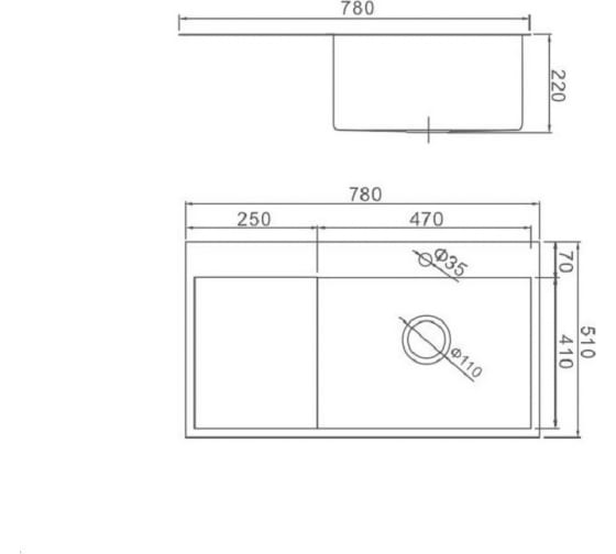 Размер мойки: ширина 78 см, глубина 51 см, высота 22 см. Размер чаши: ширина 47 см, глубина 41 см, высота 20 см. Минимальный размер отверстия в столешнице для врезной установки: ширина 75 см, глубина 49 см.