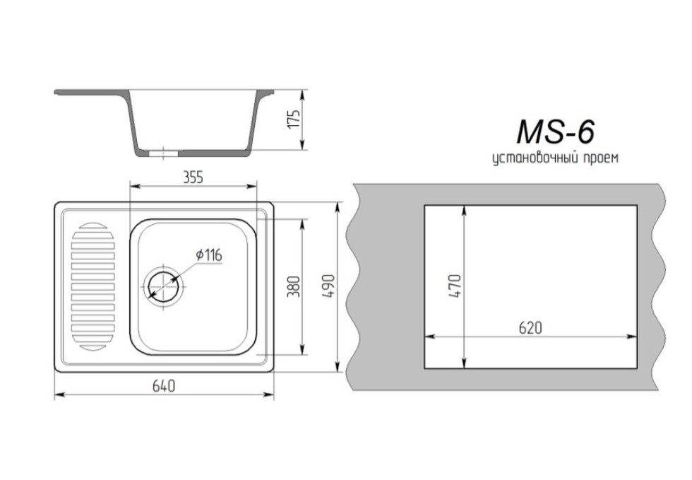 Вырез под мойку : 620 х 470 мм