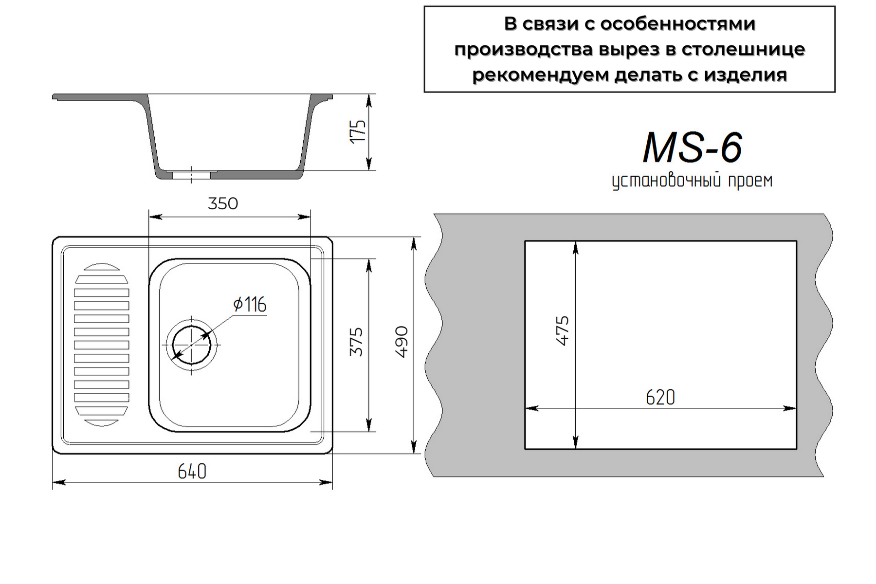 Общий размер мойки (мм): 640 х 490 Размер чаши (мм): 355 х 380 х 175 Короб: 54,5 х 65,5 х 26