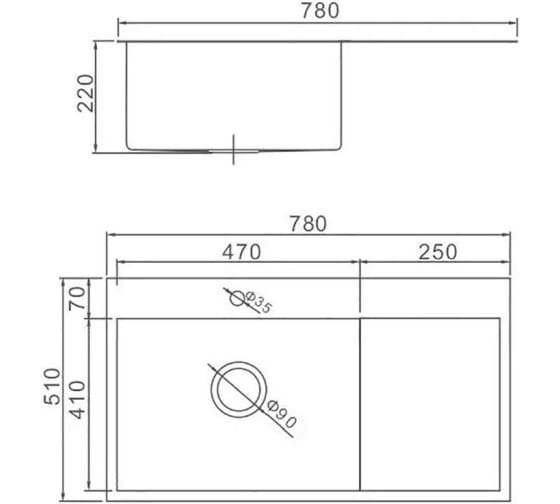 Размер мойки: ширина 78 см, глубина 51 см, высота 22 см. Размер чаши: ширина 47 см, глубина 41 см, высота 20 см. Минимальный размер отверстия в столешнице для врезной установки: ширина 75 см, глубина 49 см. В связи с особенностями производства в геометрии мойки допустимо расхождение 1-3мм.Мойка устанавливается на герметик и прижимается грузом. При Данном способе установки края будут плотно прилегать к столешнице.
