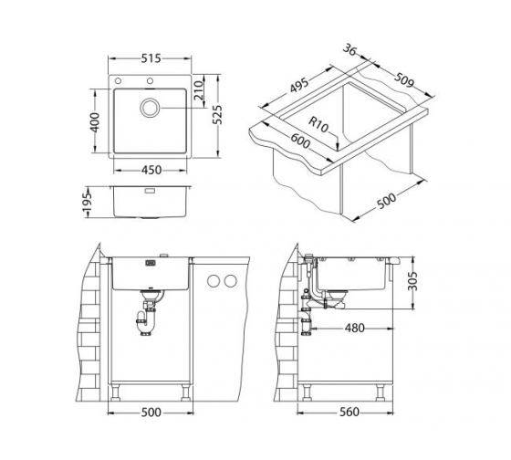 Размеры врезного отверстия (накладная) | 495x509 мм / угловой радиус врезки: 5 мм / |
