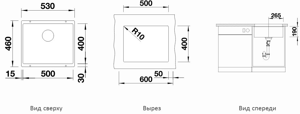 Размеры врезного отверстия (под столешницу) | 500x400 мм / угловой радиус врезки: 10 мм / |