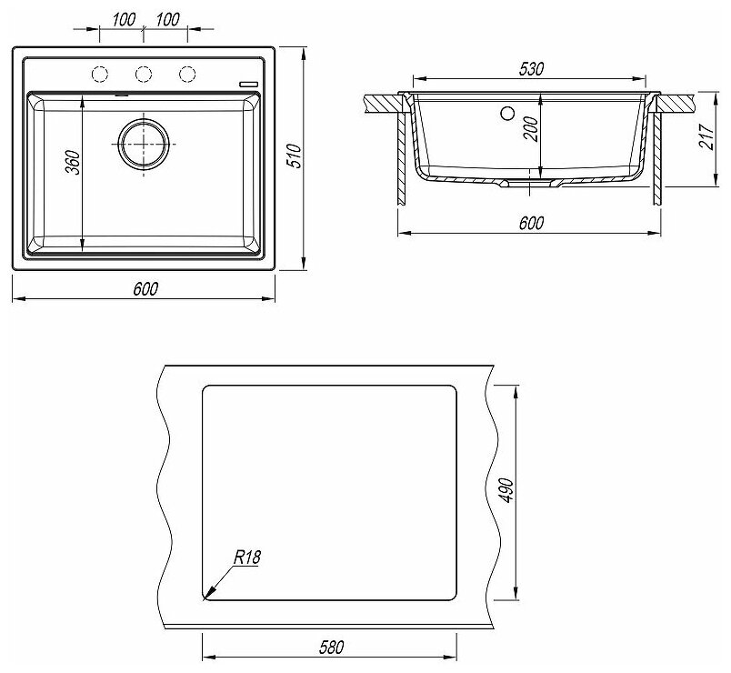 корзинчатый вентиль, отверстие под смеситель, сливная арматура