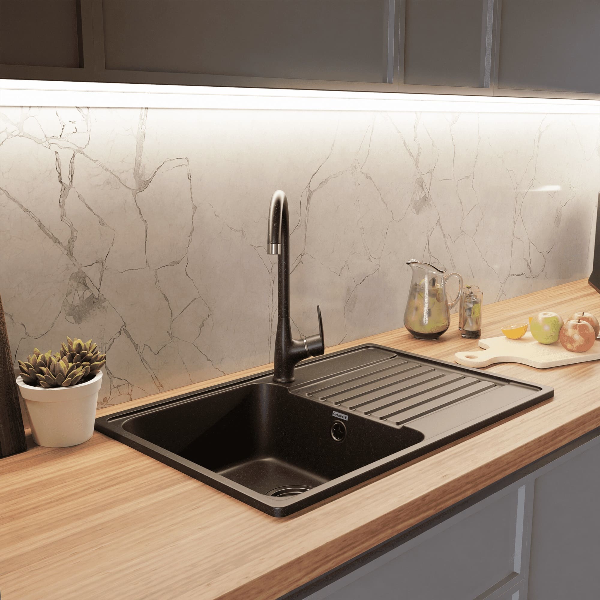 Мойка для кухни GranFest Quarz GF-Z78 – вариант для тех, кто поддерживает актуальную сегодня концепцию минимализма. Благодаря своей лаконичности модель легко впишется в помещение, оформленное практически в любом стиле – от классики до хай-тека. Цветовая палитра состоит из 6 натуральных оттенков, каждый из которых способен привнести в интерьер ощущение естественности и уюта. А текстура натурального камня добавляет нотку благородства и изысканности. Мойки для кухни GranFest Quarz сочетают в себе высокое качество и прекрасные потребительские характеристики: • ударопрочность; • устойчивость к царапинам; • отсутствие пористости; • устойчивость к воздействию высоких температур (мойки выдерживают перепады температур от -40 до +242 °C); • антибактериальные свойства (на поверхности мойки не размножаются бактерии); • гидрофобность; • защиту от воздействия красящих веществ. Мойка для кухни GranFest Quarz GF-Z78 имеет чашу достаточной глубины, благодаря чему в ней вы сможете разместить даже высокие кастрюли и другие объемные кухонные принадлежности. Главная особенность модели – удобное широкое крыло. На нем можно сушить посуду, располагать только что вымытые овощи и фрукты, размораживать мясо, рыбу и другие продукты. Использование в качестве материала 80 % частиц кварца и 20 % связующего компонента обеспечивает повышенную прочность и долговечность мойки.
