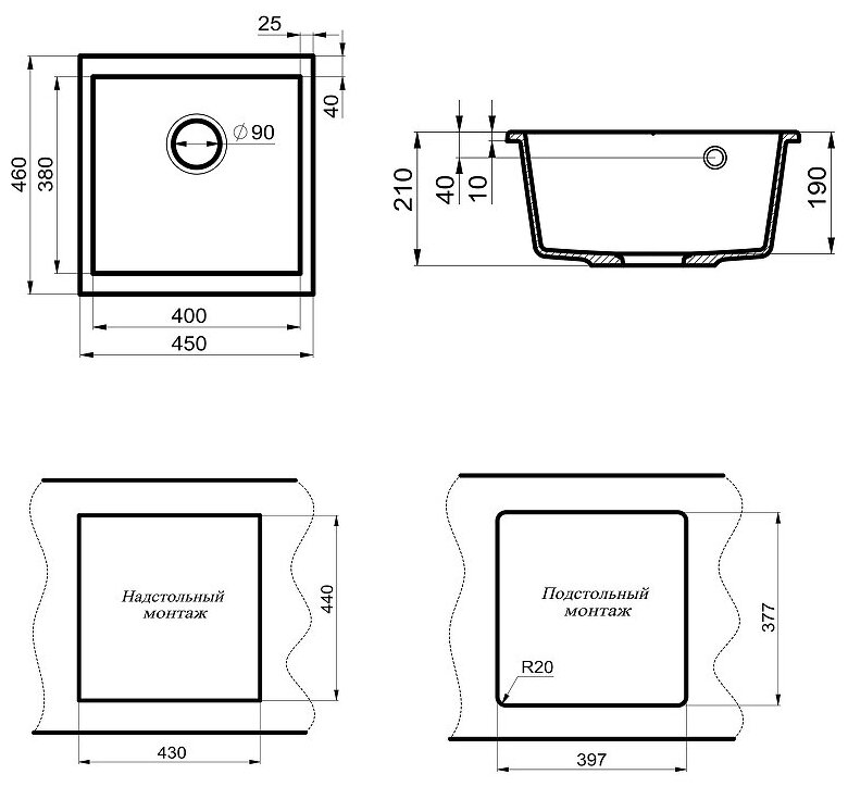 Универсальный монтаж ( на столешницу, под столешницу, вровень со столешницей). Монтажная ширина, см (подстольный монтаж / врезной монтаж ) - 39.7/43