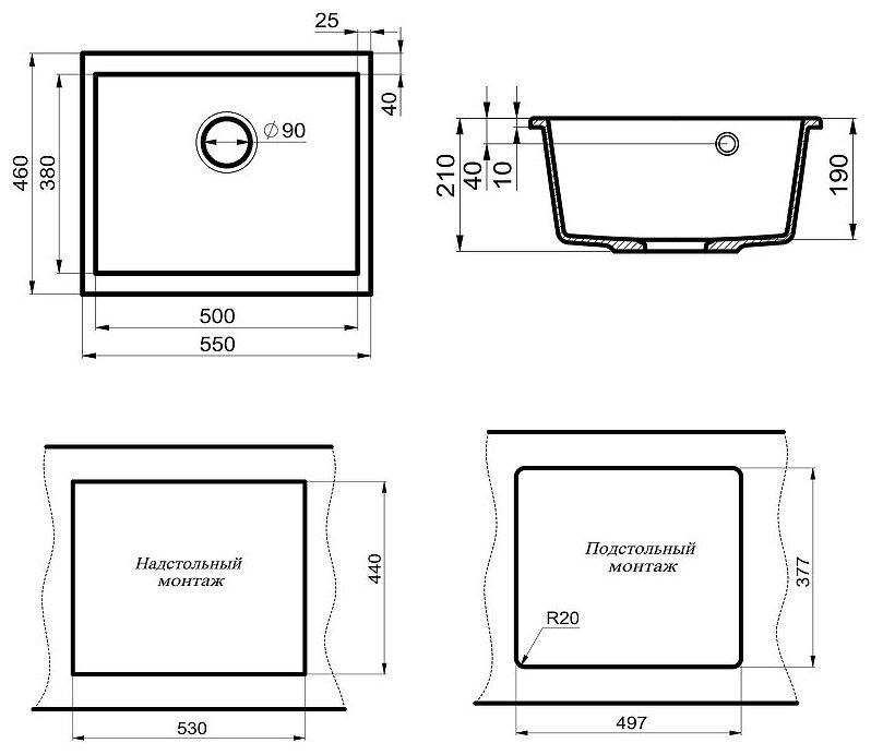 Универсальный монтаж ( на столешницу, под столешницу, вровень со столешницей). Монтажная ширина, см (подстольный монтаж / врезной монтаж ) - 49.7/53